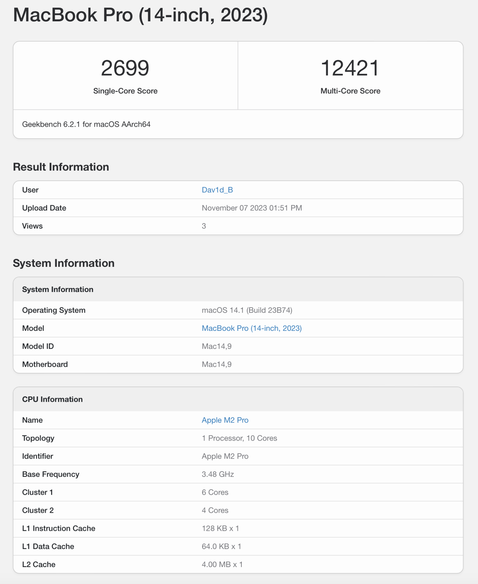 M2 Pro CPU Test: 12421 (Multi-Core), 2699 (Single-Core)