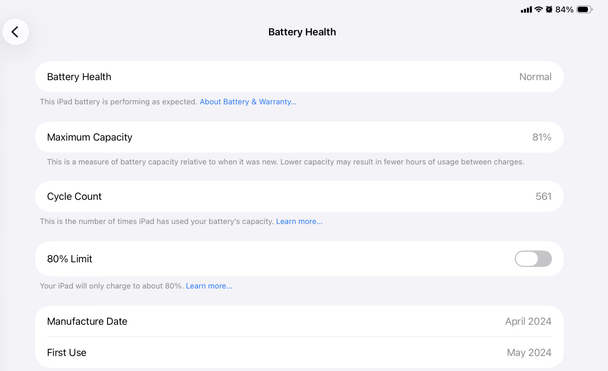 M4 from 5/24, 202 cycles, 87% battery health. I think the reason for this is poor charge protection in older versions of the OS. My iPad is connected to a display when it is usually at rest on my desk, meaning it is on charge most of the time. When I got the device, charge protection at the time seemed a lot more rudimentary (80% limit would cause more charge cycles because it kicked in the second it dropped below 80%, and the monitor connection wouldn’t sleep the monitor during iPad sleep, just blank it out, so the parasitic drain was a lot higher) and I think having it on charge. Also, I’ve gone through a few of the OS betas, and the charge protection often degrades during the beta process. On 26, I’m seeing no hit to having it connected to a monitor so much, with no change in battery health since the public release of 26.