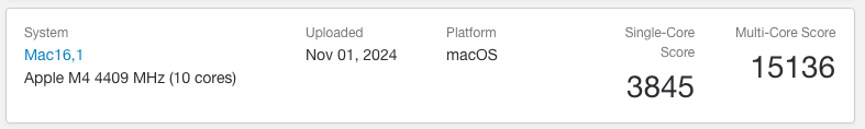 MR 10/28 posted 4.3 versus 4.05. So if "Geekbench shows M4 Pro and Max both clocking in at 4.5 GHz" that is a very substantial reported difference. Are MR's numbers a spec and Geekbench's numbers as-tested? Perhaps someone could explain.Geekbench shows M4 Pro and Max both clocking in at 4.5 GHz, give or take a few MHz.. What is interesting is differentiation by models. Mac16,7 has results for both M4 Pro and Max, Mac 16,11 just the Pro. All of the 16,11 single core scores are around 35-3600, all of the 16,7 scores are around 39-4000, including the result for the M4 Pro in a 16,7. This could be a sign 16,11 is the Mini and could potentially be throttling more with the smaller chassis.
