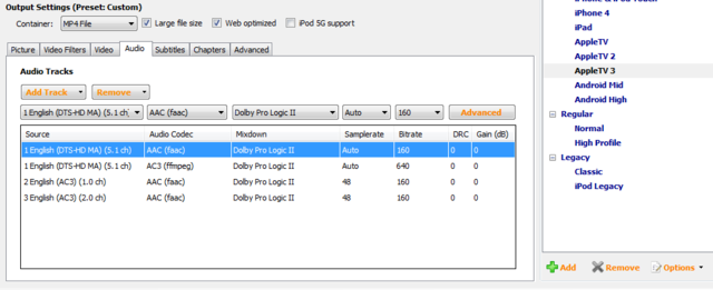 I am ripping my James Bond Blu Ray collection to iTunes using Handbrake and MakeMKV. I created the MKV with all available audio tracks. I'm using Handbrakes AppleTV 3 preset to get 1080p. Will this let me rip with the 5.1 audio and the audio commentary? Do I need to select all the audio tracts manually? How would I switch between the audio tracks. I tested the MKV in VLC player and switched between tracks perfectly but I'm not sure about M4Vs. I would like to make sure I get the settings correct before converting for 5 hours only to have to re do it again.
