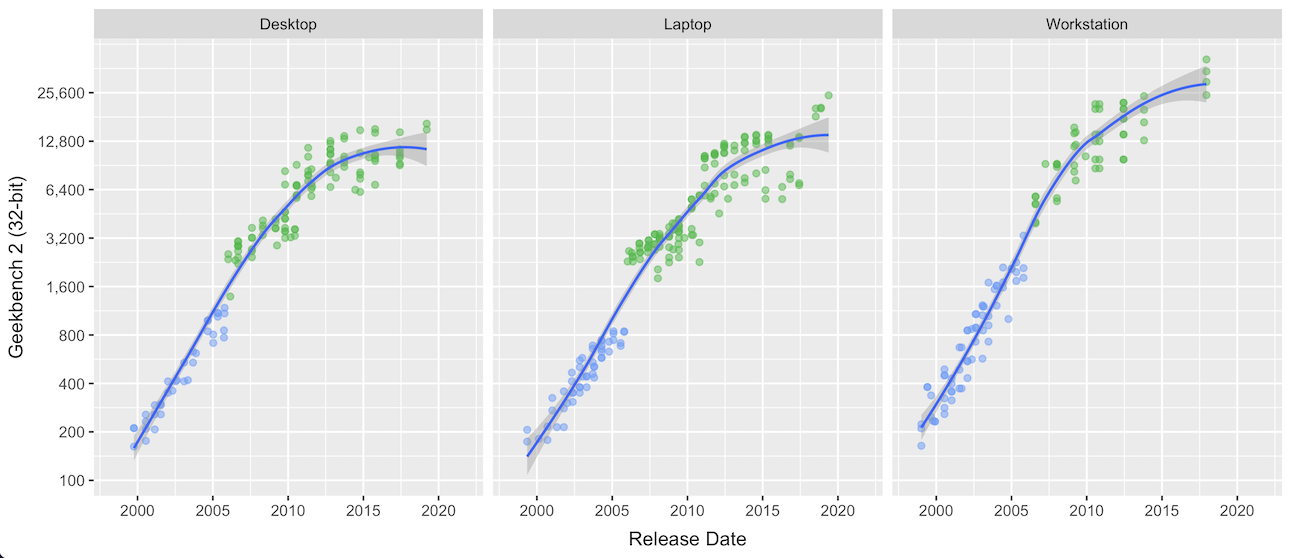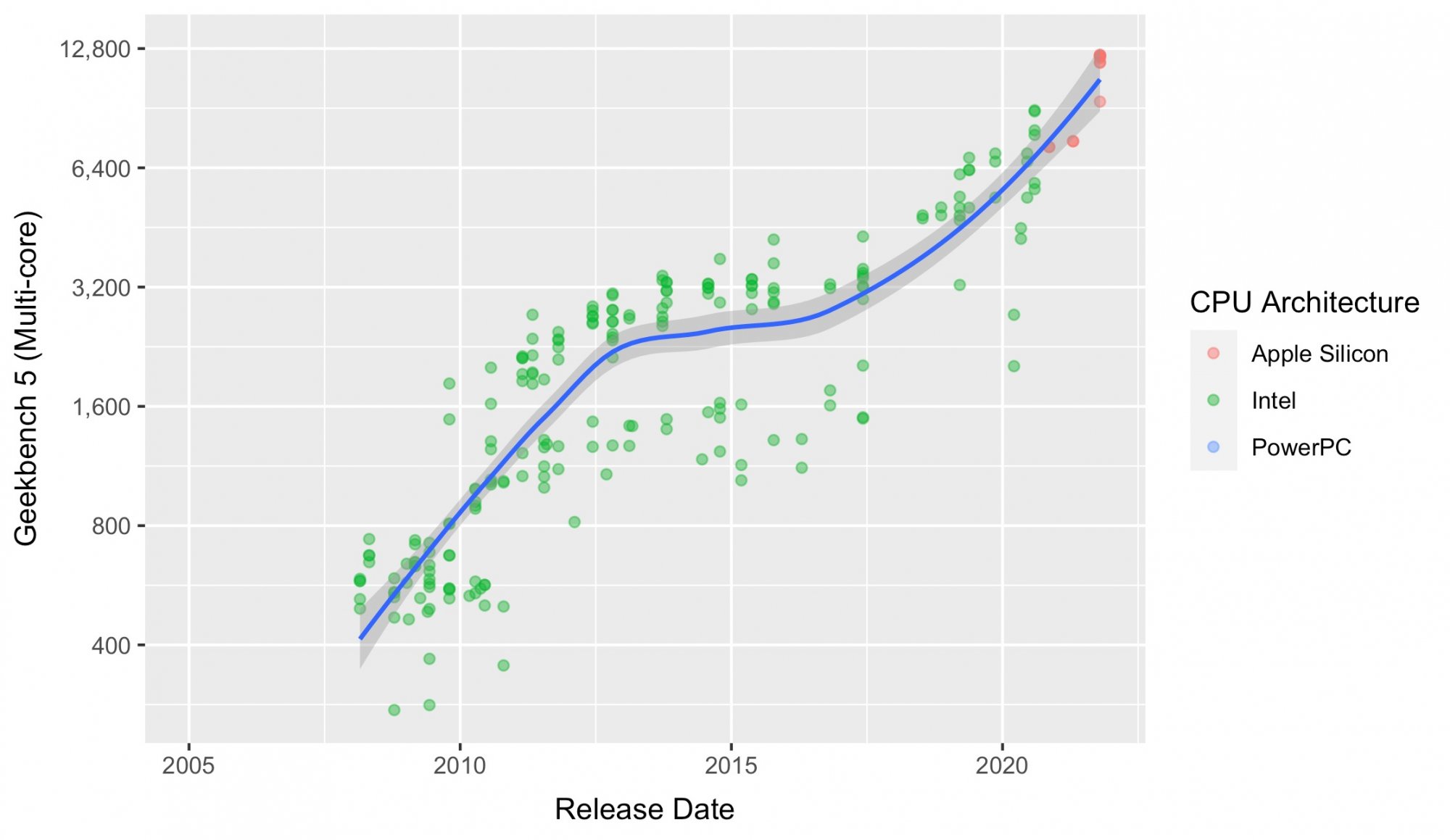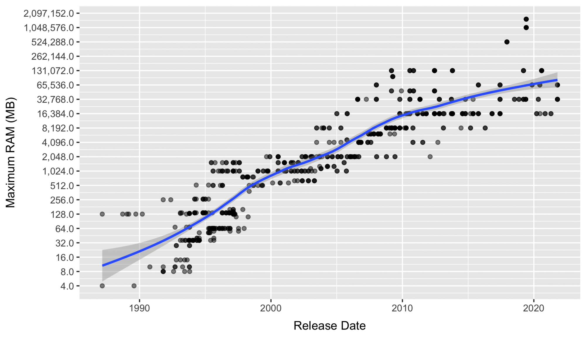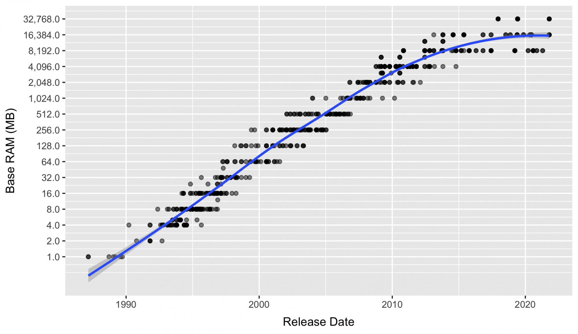 A few week ago, I got curious about the rates of change in computer specs over time. I've felt for ages that the rate of spec increases in desktop/laptop hardware has slowed significantly in the past 10 years (for Macs and PCs alike), but I wondered whether that was actually supported by data. Since there are data sources that have detailed records of the specs for every Mac ever made, I decided to try and wrangle and plot that data in R to see what showed up.