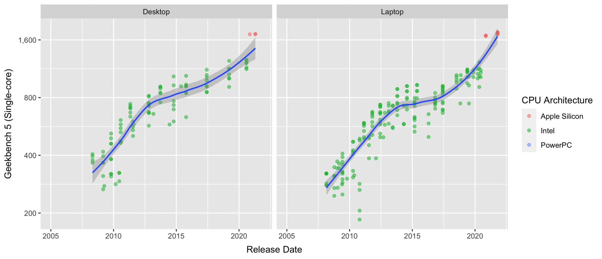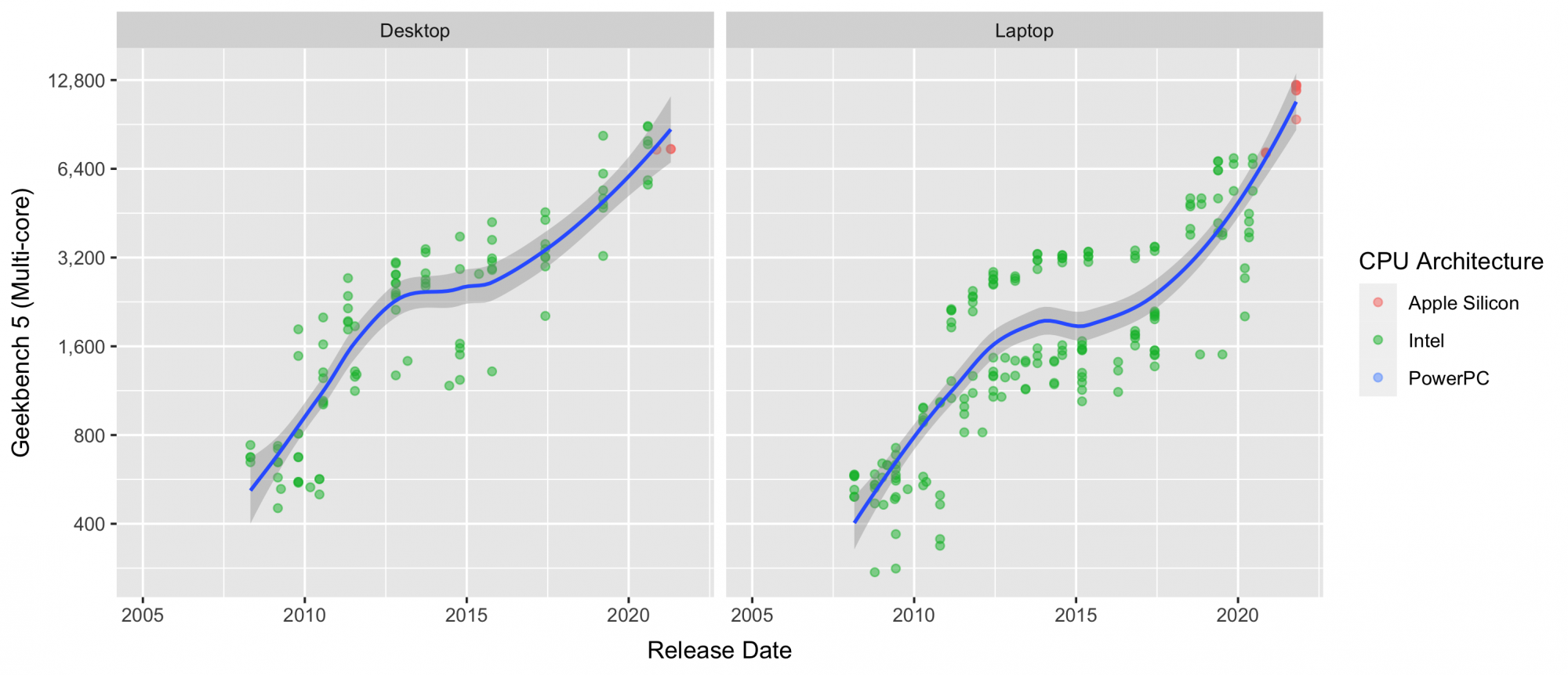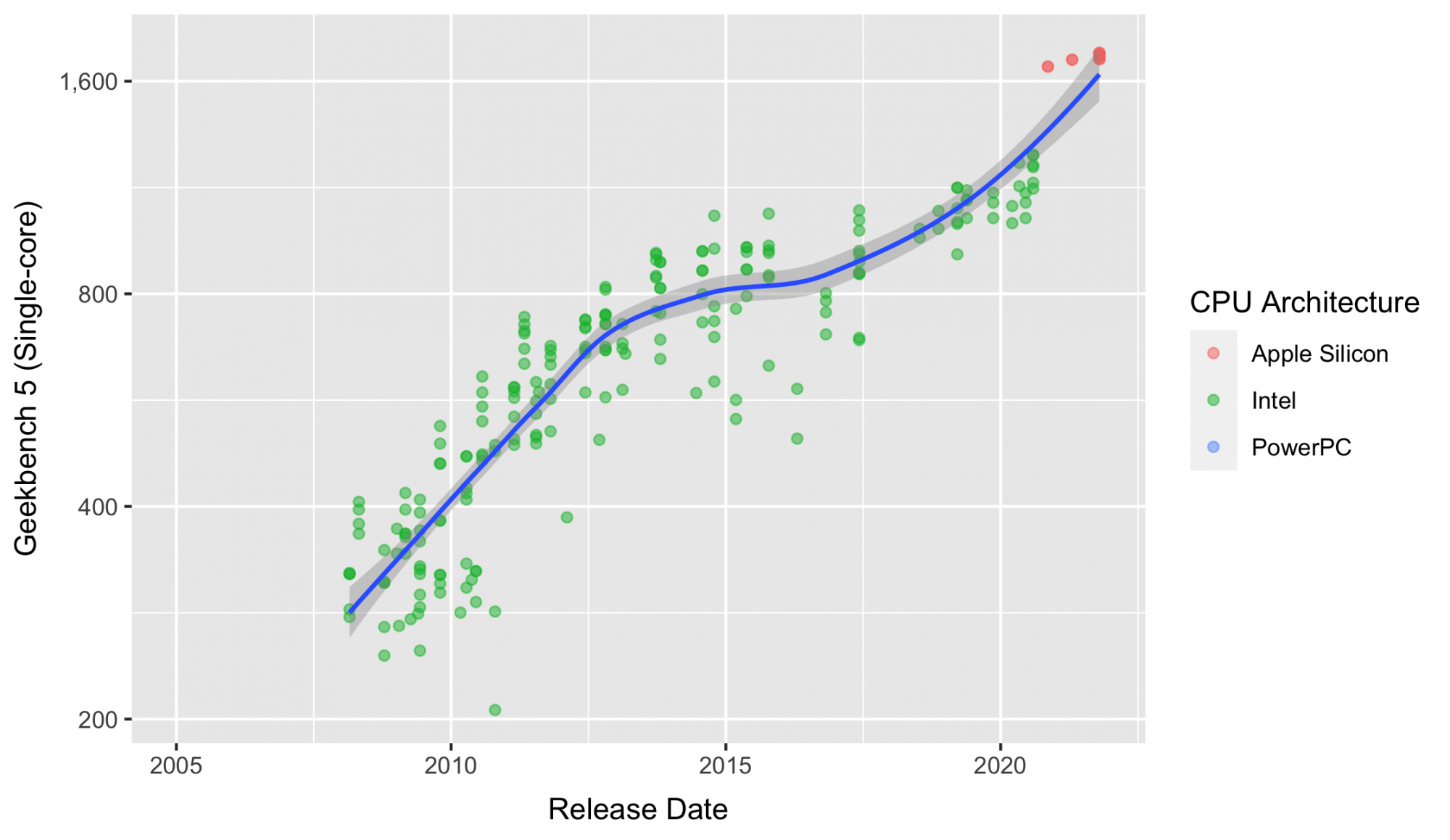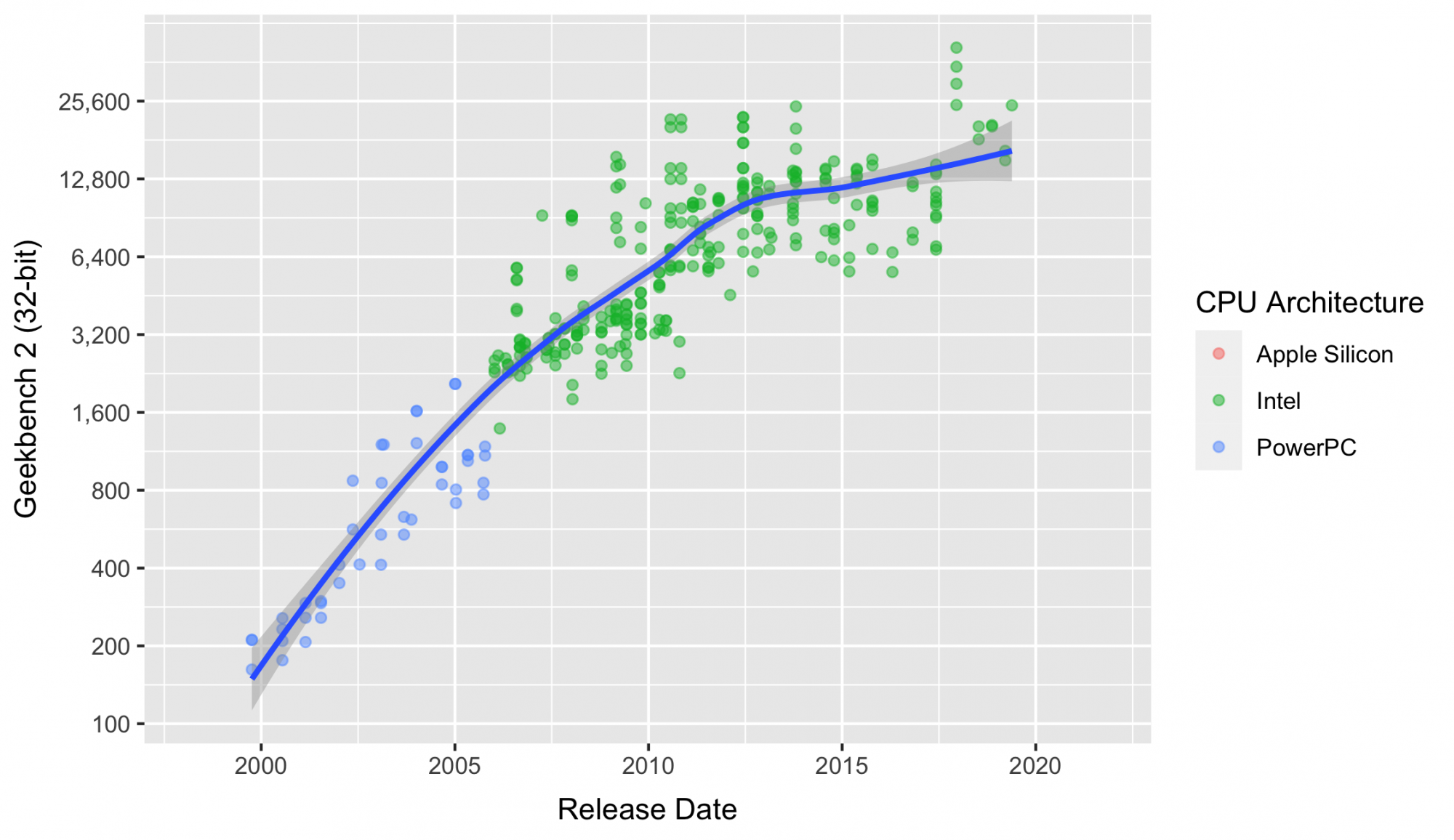 A few week ago, I got curious about the rates of change in computer specs over time. I've felt for ages that the rate of spec increases in desktop/laptop hardware has slowed significantly in the past 10 years (for Macs and PCs alike), but I wondered whether that was actually supported by data. Since there are data sources that have detailed records of the specs for every Mac ever made, I decided to try and wrangle and plot that data in R to see what showed up.