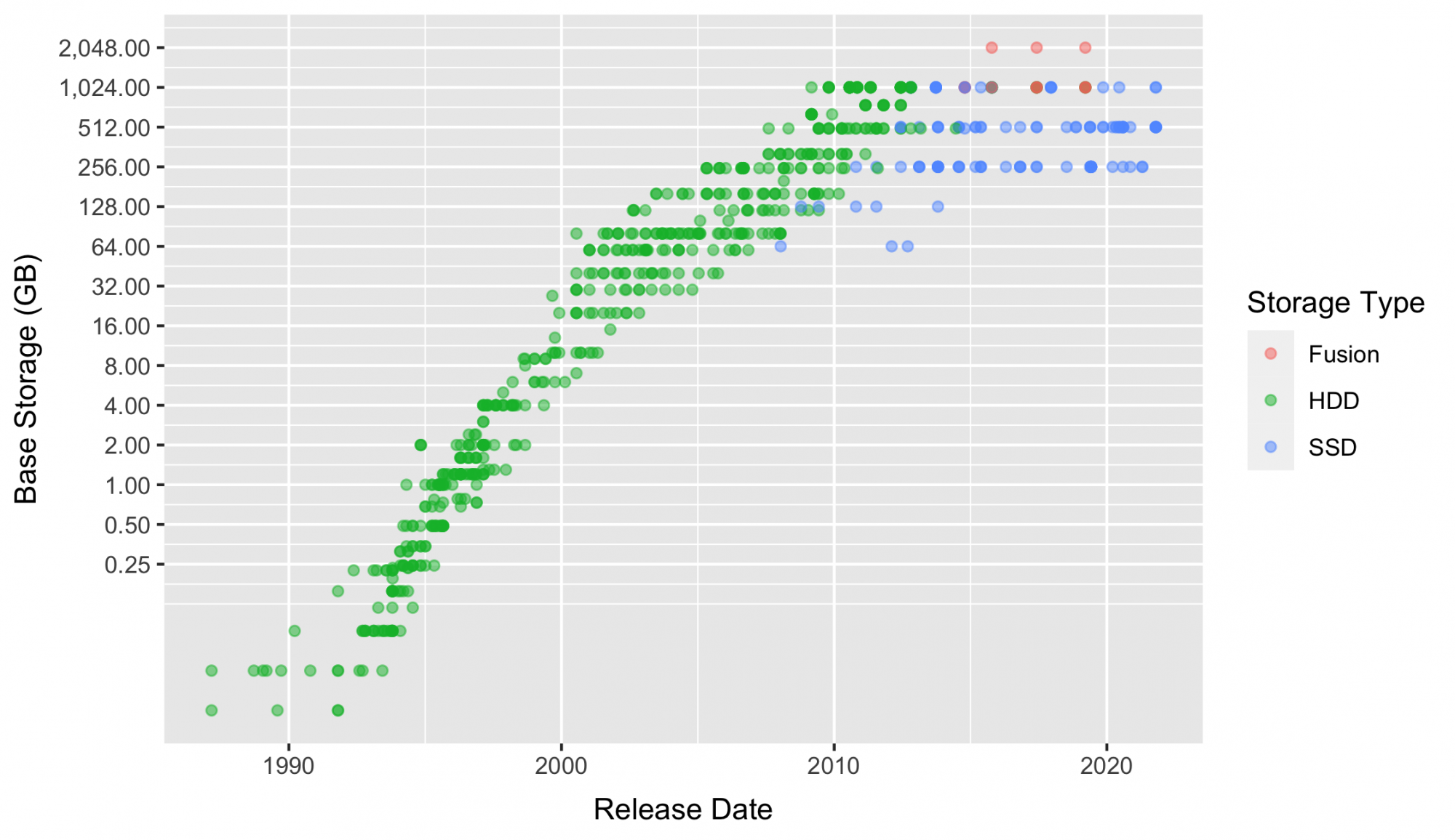 Finally, here's the base storage capacity over time, with the colours of the points indicating the type of storage (HDD, SDD, or Fusion):