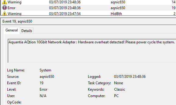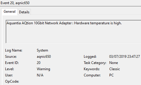 The 10GbE NIC in my mini 2018 keeps dropping the connection and stating that the cable is no longer connected when run in Windows 10 1903.