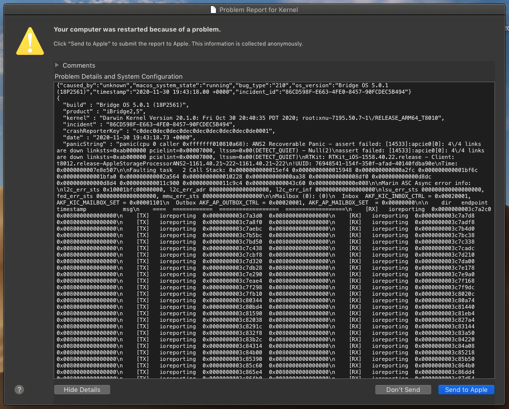 As you can see, Bridge OS has the latest version from Big Sur, but it still crashes.