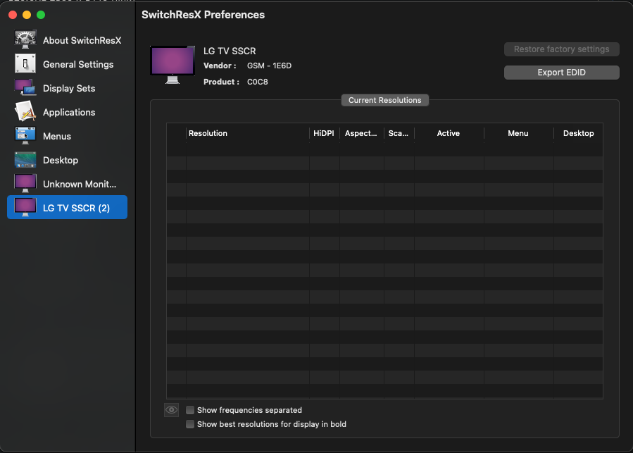 Yeah. I tried the non beta version of SwitchResX and set a custom resolution but its not recognized as valid.SwitchResX 4.11 a beta work in progress - who knows if it will be able to support the features of Intel Mac. If Display Overrides still work, then at least that feature should work - but in your screenshot, the Custom Resolutions tab is missing - so maybe not.