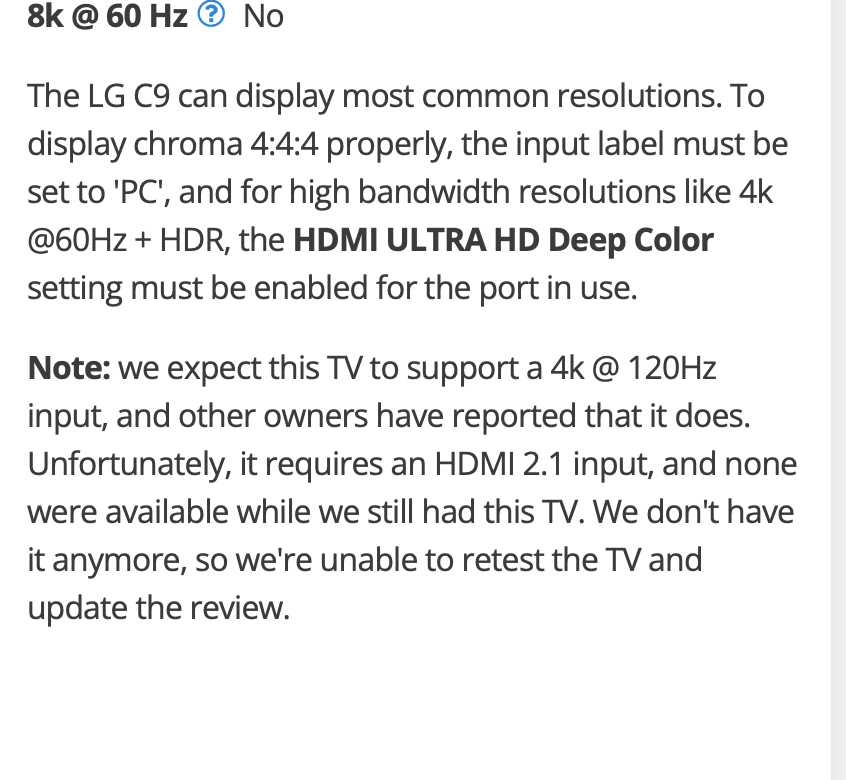 Iam not sure if 40Gbps is enough. When looking to @Alan Spiegel he has an C1 with RGB 10b 4k@120hz working. Dont know if RGB has less Bandwidth compare to uncompressed 4:4:4. Audio takes also some Gbps i think.The C9 supports 4:4:4 4k@120 12bit with 48 Gbps I believe. Not sure about 4:4:4 40 Gbps