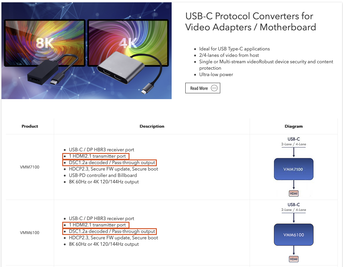 Announcement. Synaptics have recently released VMM7100, a new single chip USB-C to HDMI 2.1 bvideo interface. [So I'm guessing that this chip supercedes the VMM6100]