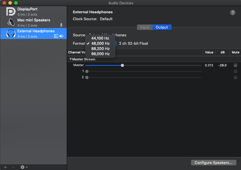 On a Mac computer, there is an application called Audio Midi Setup. You use this to control how your computer records audio and plays audio. The screenshot below shows your choices if you want to play audio (output). The choices are 44.1kHz, 48kHz, 88.2kHz and 96kHz. Interestingly, the default for playing through speakers is 44.1kHz, but the default for playing through headphones (which is what I have chosen for the photo) is 48kHz.