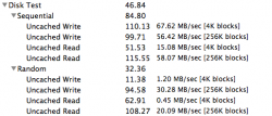 I tested my external lacie disk over firewire, that had speeds close to 70MB/s.