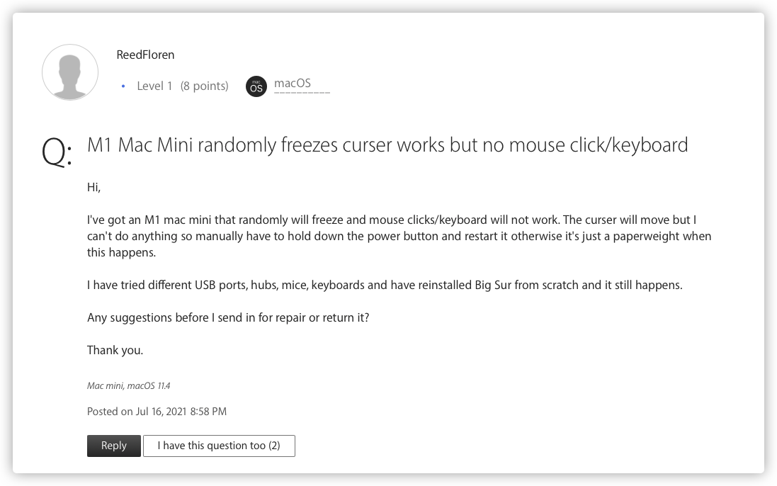 Thanks for the response. When it last happened (yesterday) I was running iterm, npm watch with a react app, vscode, Firefox … a bunch of apps. 5-6 hours in the wired Kensington expert trackball, wired keyboard, and magic trackpad stopped responding but came back for a few seconds ever 30 seconds or so. I assume the entire Mac is freezing up. The last few times it crashed I saw applications (code meter and Antares manager) in the console crash logs around the time of crash and uninstalled them. Didn’t see a crash log event after the latest crash. I see some attribute the issue to usb hubs in the type A USB ports, I just freed up all the USB A ports and connected up my Caldigit tb3 hub. Hopefully it helps and doesn’t complicate matters. 🤞🏻@boomspot