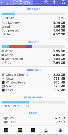 You didn't say what you're doing with the machine, aside from "everyday tasks".I downloaded iStat Menus thanks to this thread (or one like it that showed how it records memory pressure over time).