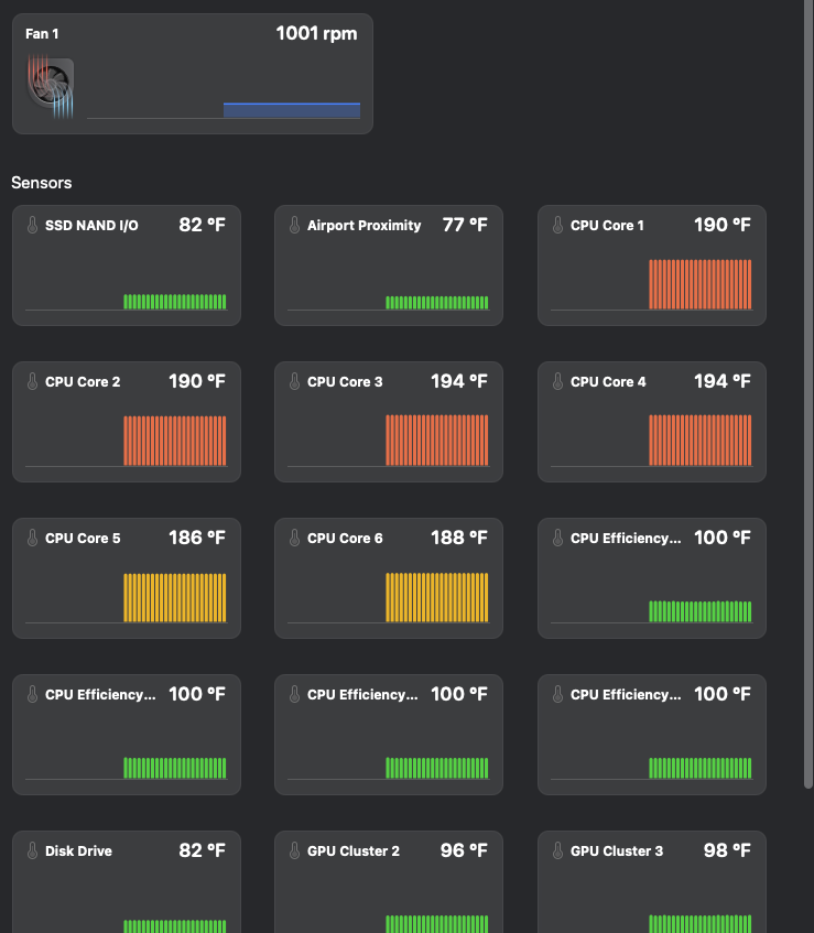 I have a new Mac mini M4, Set up last week, I am running MacOs 26 public beta, I have noticed it running hot, see pick. it up am running one monitor and my space is air conditioned and at 70 degrees, the unit is installed vertically in a Minisopuru vertical dock. I run iStatistica Pro and have been monitoring the temps, among others and noticed it staying around 160F which I do not consider hot, today I had cores running 195f which to me is hot, yesterday I installed a fan with my set up to assist in ventilating het from my set up and when I checked to well below is screenshot of both sensors temp and CPU load at same time. I am new to Apple silicon but definitely not new to Apple, still run the MacBook Pro I bought new in 2020 and it never reaches these temperatur