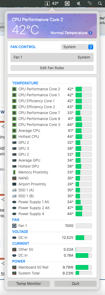 In anniversary area of Tanaris with a decent amount of player activity and NPCs let's just say the expected temperatures, leaning on the side of "too hot", are 87˚ celsius. The hottest parts of the Mac, according to the most recent version of TG Pro, are the performance cores and GPU. Not all P-cores and GPU cores were the same temp, load was on some cores more than others. Ambient temperature, according to TG Pro, was 60˚. At the busiest the framerate averaged around 83fps.
