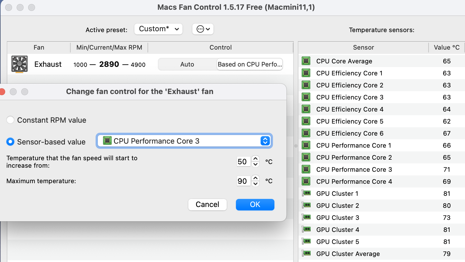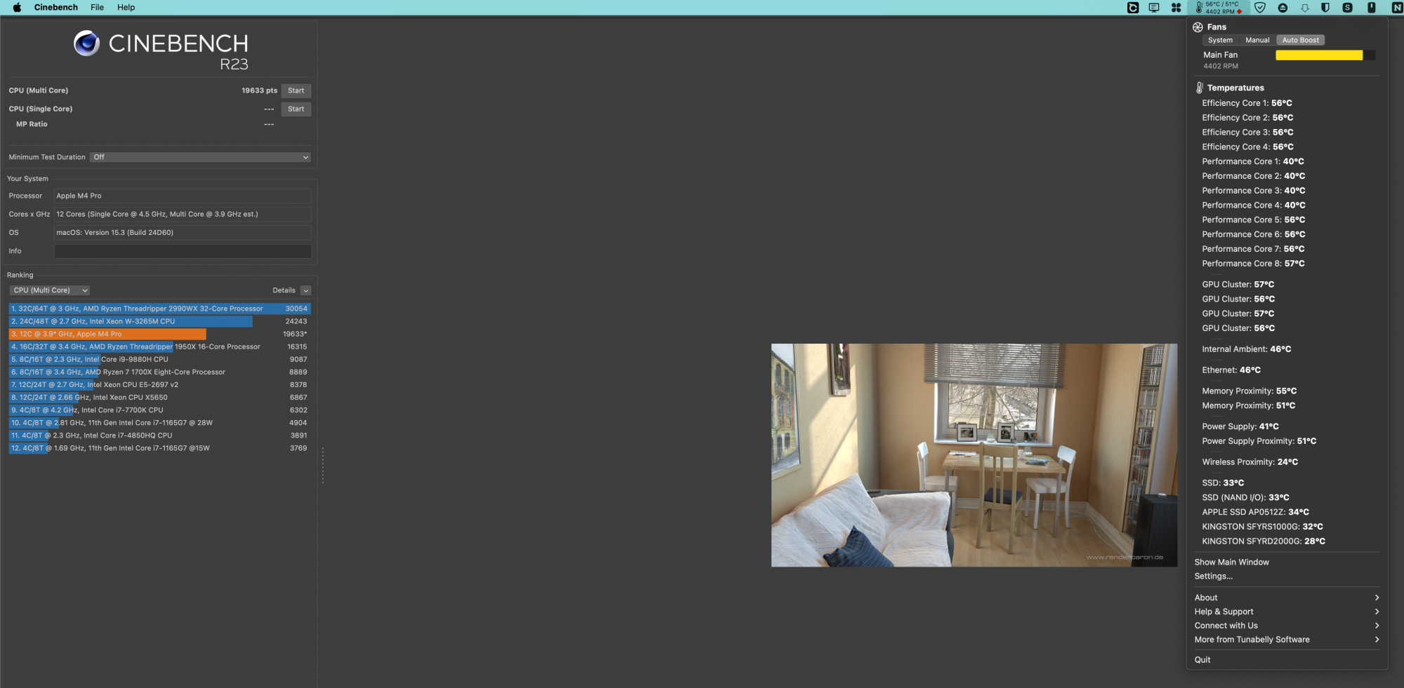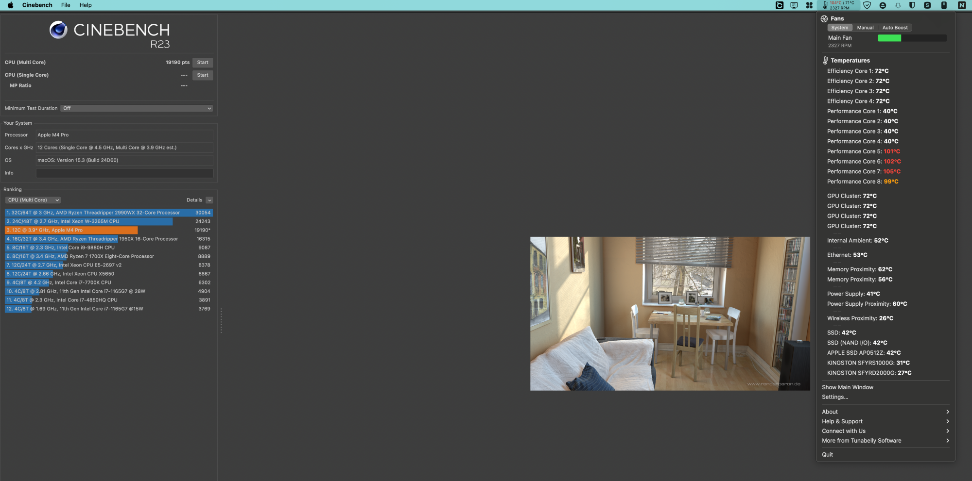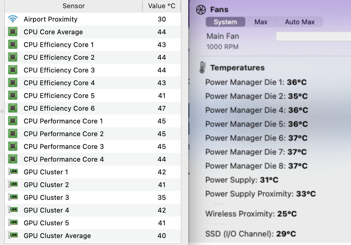My Mac Mini M4 Pro 12c get with CB23 19100 points and System Fan Settings 105 celsius, this is very very high. With my Fan settings from above i get 90c and 19700 points but the fan are very loud with max 4500rpm.