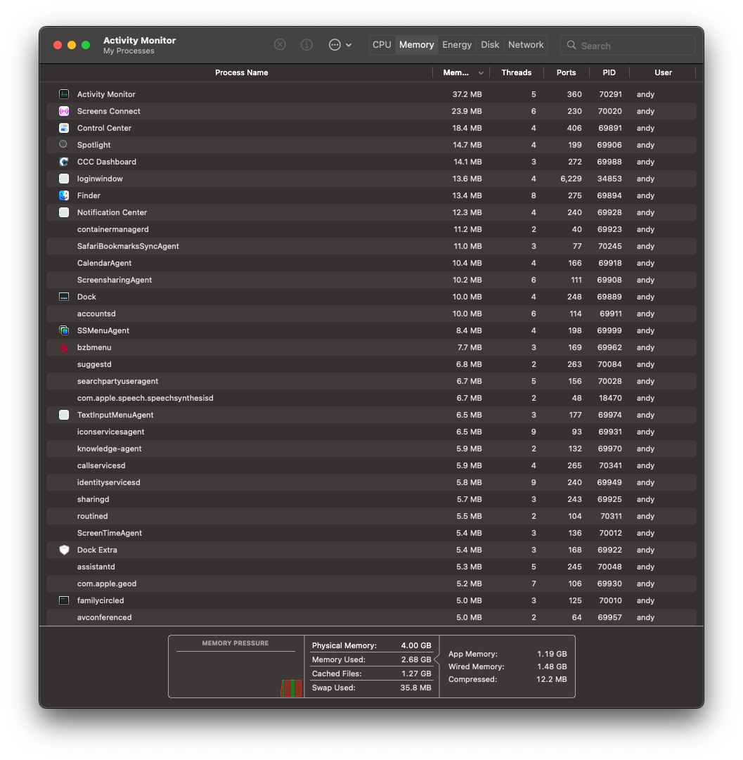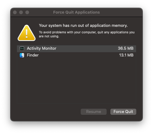 Now, just booting up the machine gets me "out of application memory" errors. Granted, the machine only has 4 GB of RAM, but I'm barely doing anything with it. These errors seem to have coincided with upgrading to Monterey, but I'm not 100% sure of that. See attached screen shots.
