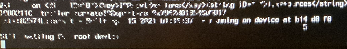 mountAttempts only gets incremented once every time IOFindBSDRoot() is called.mountAttempts doesn't get incremented within that loop, and absent a panic elsewhere, you should see Still waiting for root device messages repeated every 60 seconds. The fact that you only see it once suggests to me that the problem is elsewhere.Waiting on <dict ID="0"><key>IOProviderClass</key><string ID="1">IOResources</string><key>IOResourceMatch</key><string ID="2">boot-uuid-media</string›</dict> and Still waiting for root device usually mean that the root filesystem cannot be recognized, for any number of reasons.rd=uuid boot-uuid=224959f4-8eee-4190-a8c5-d8a992daa778 (of course, you'd substitute your own boot-device's UUID for the one I used here). That might be worth trying, just to see if the native boot-uuid is somehow getting garbled. (That said, I suspect the problem is elsewhere, and the boot-uuid handling is correct.)Could1080211 Controller::create I0Reporters 0xXXXXXXXXXXXXXXXX