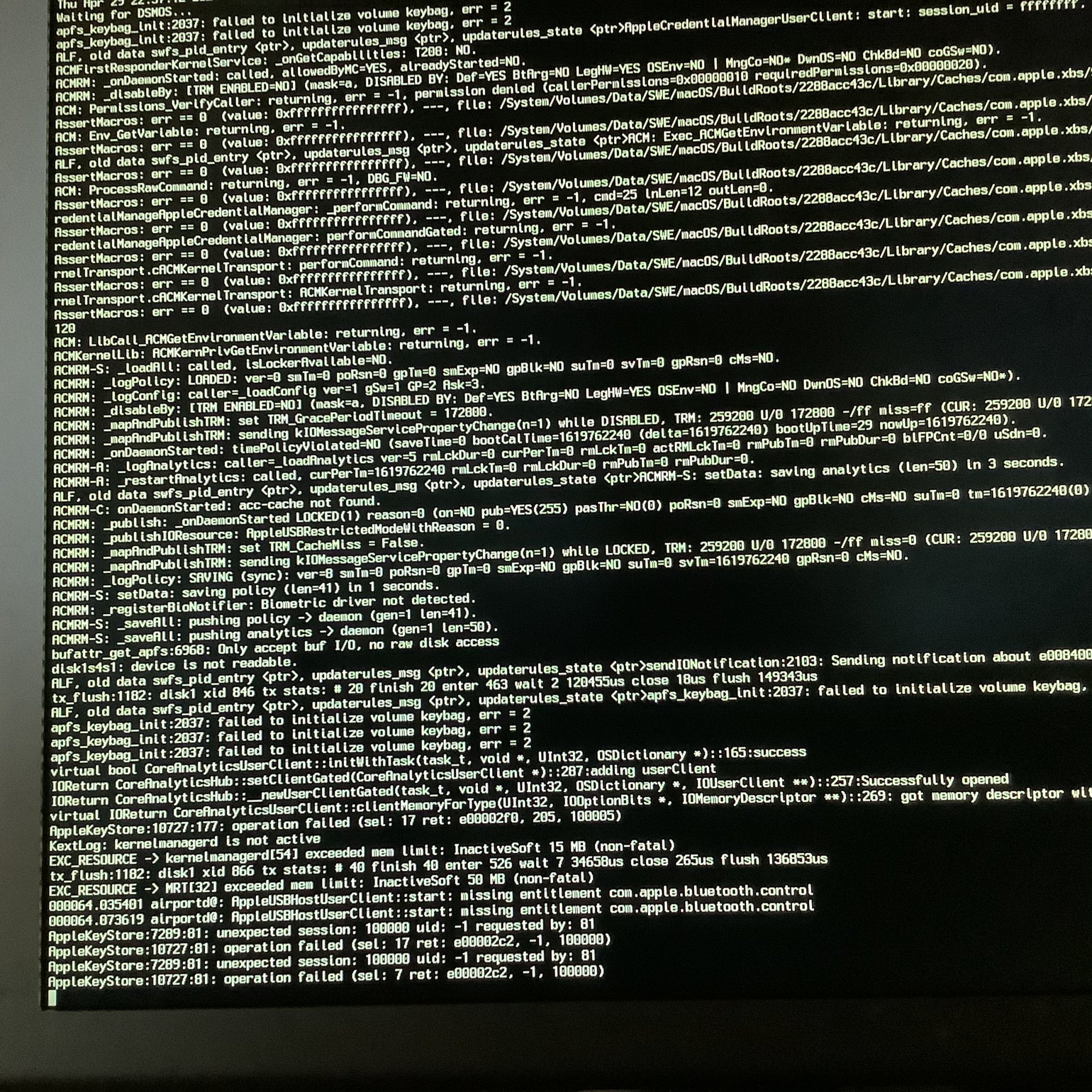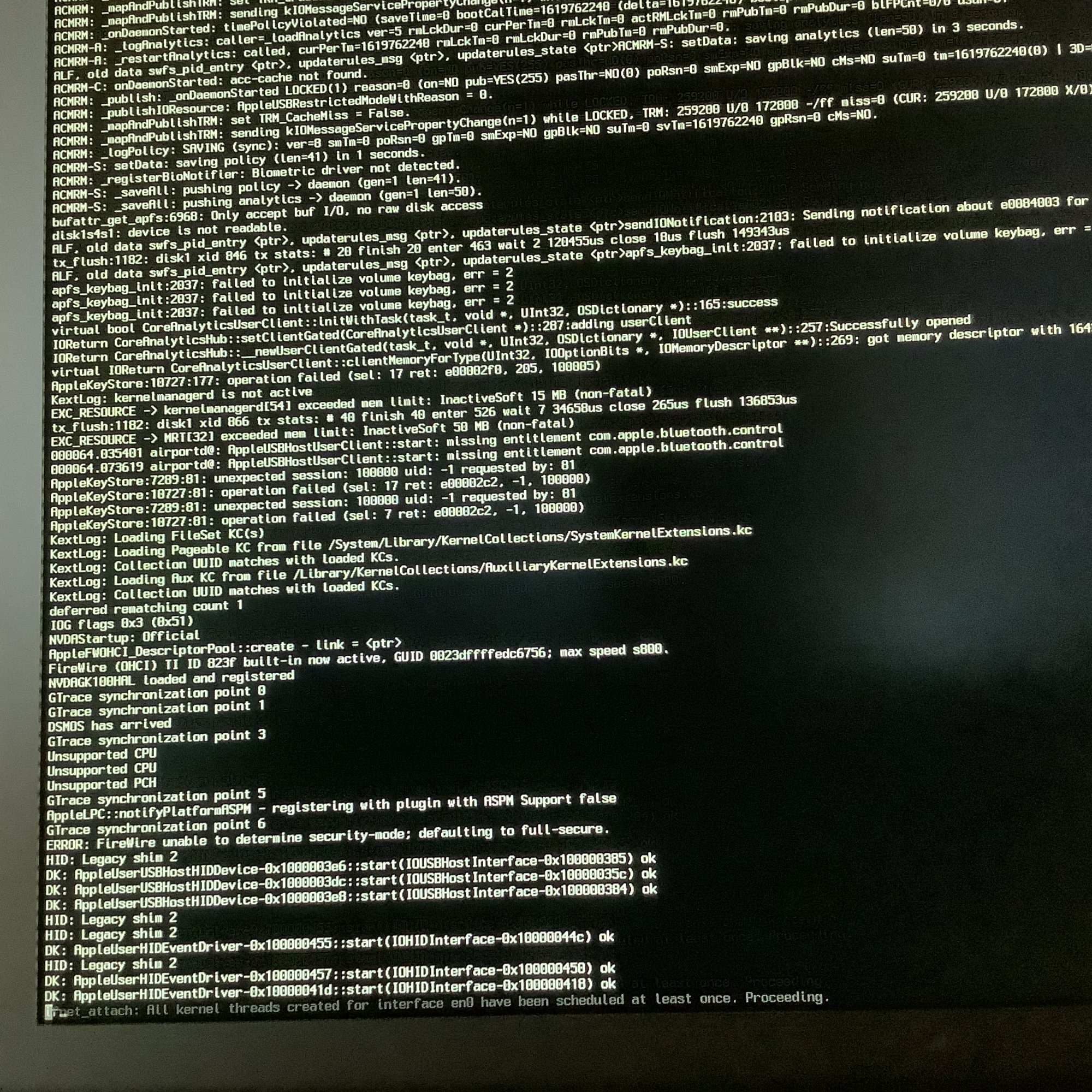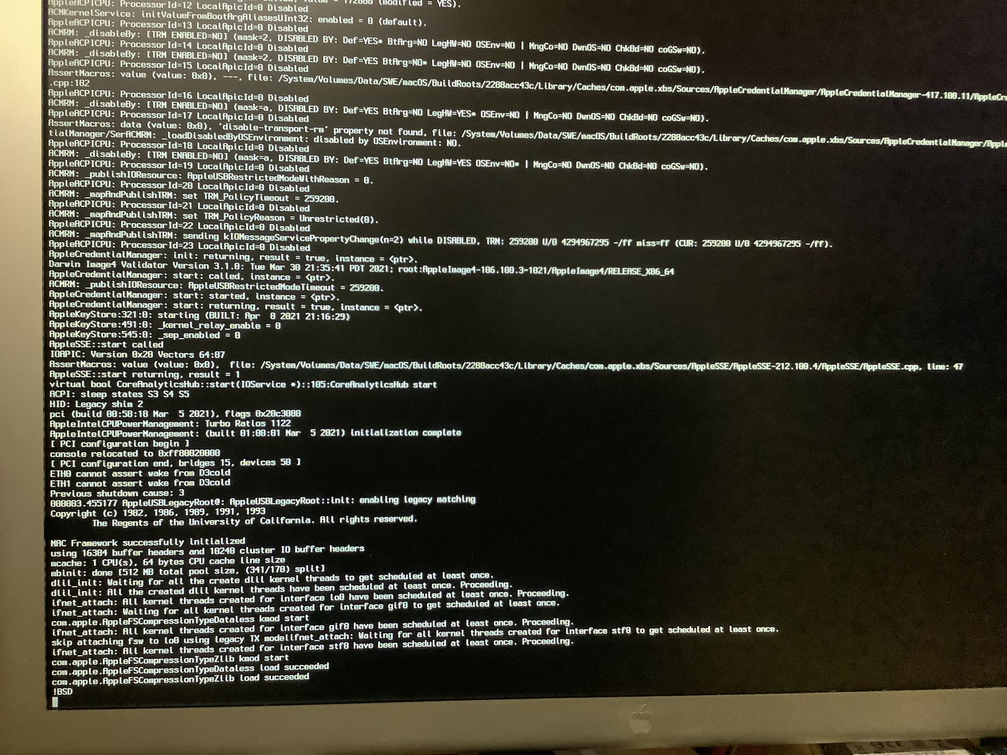 !BSD message.So with the old apfs.kext, 11.4 hangs at boot on the Mac Pro 5,1, but boots fine on a MacBook Pro? In that case, we know it's not the APFS kext.I can take the same SSD and boot it as a usb drive on a MBP11,3 without an issue.