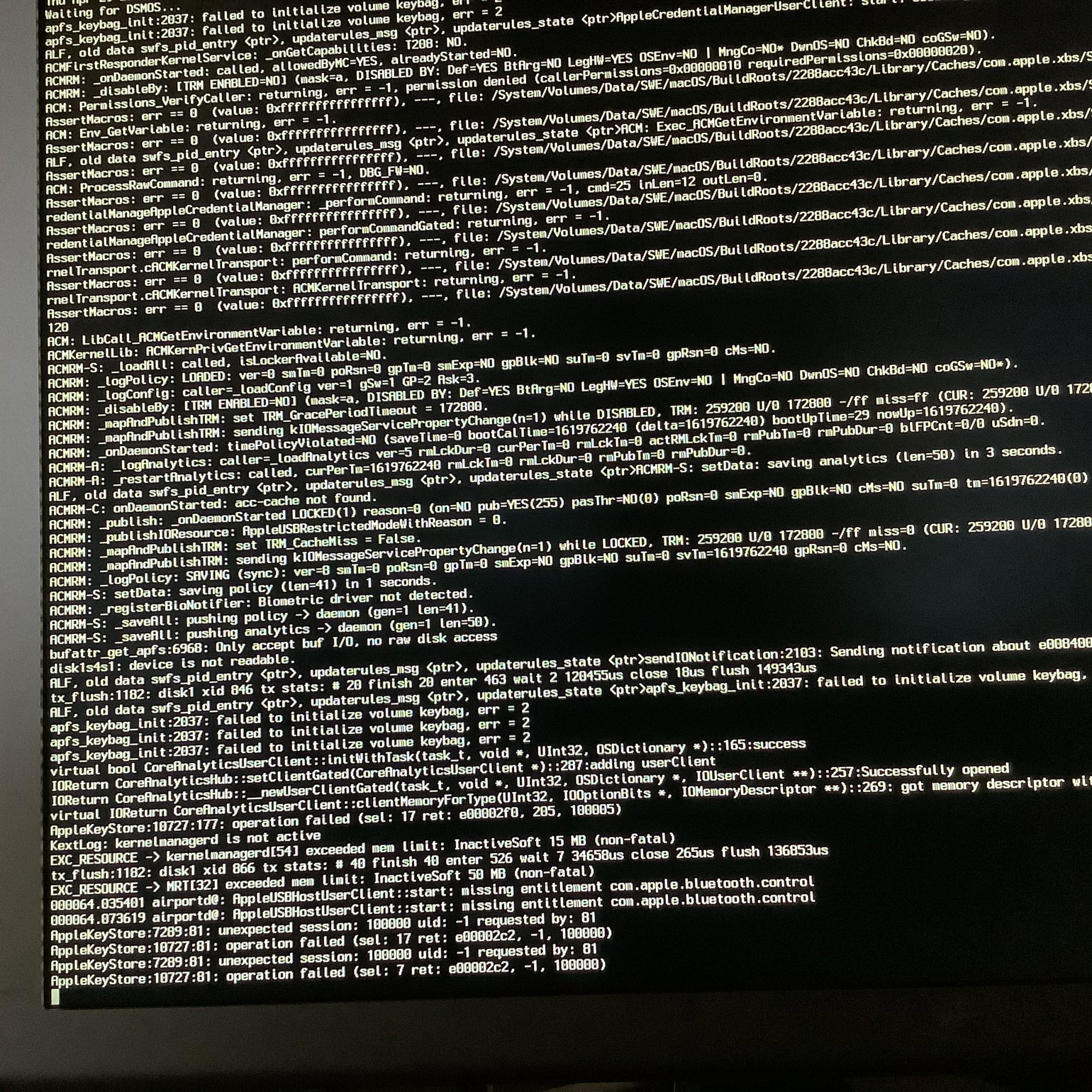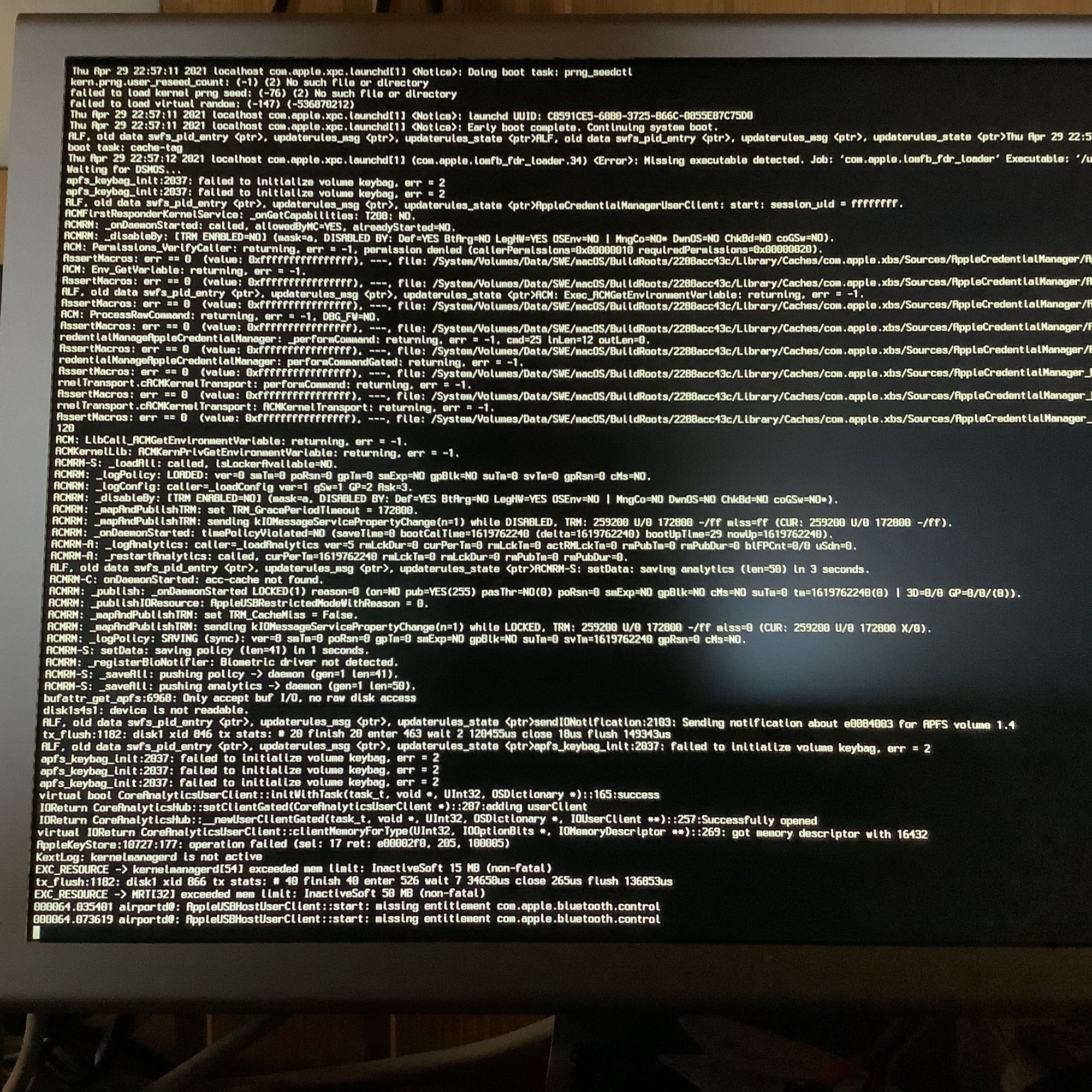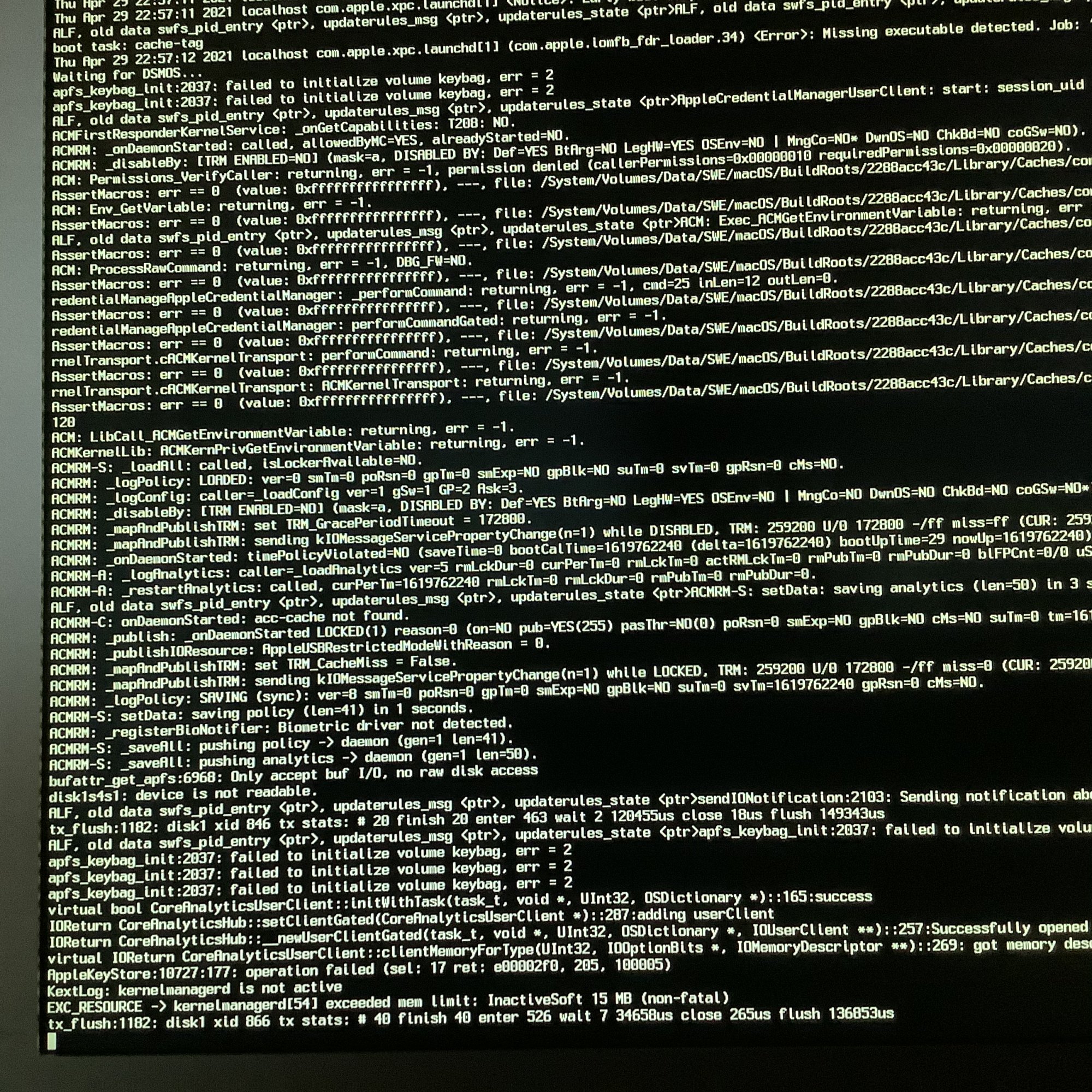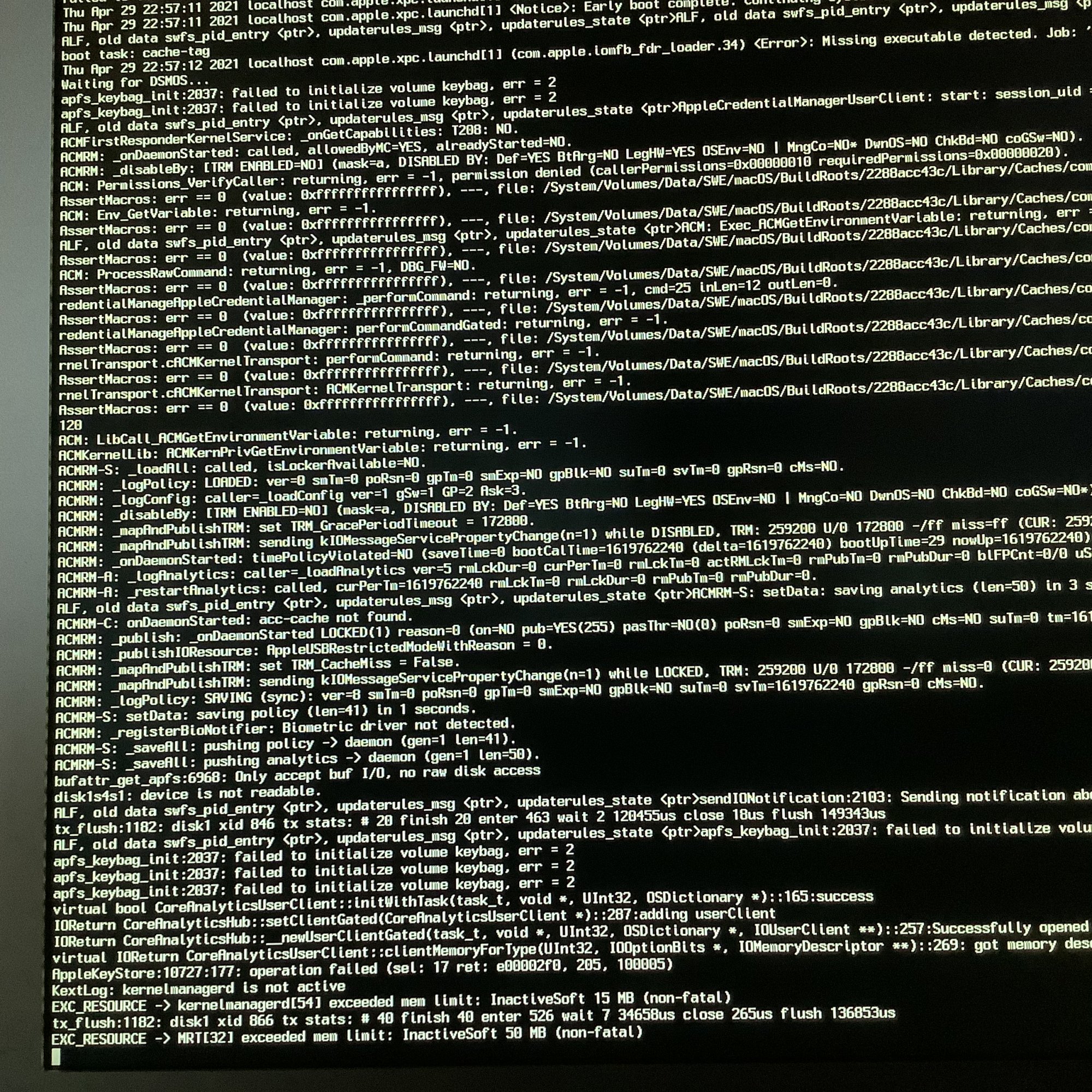 AFAIK, this has nothing to do with the race condition that we are trying to find. You are not doing block clone/restore operations while booting the kernel.The following comment might be a red herring, but, just in case it somehow helps the experts, I'm bringing up the heads-up that, until recently, "asr" backups (for instance, using Carbon Copy Cloner and SuperDuper!) of Big Sur system volumes were not possible. This has changed with the release of Big Sur 11.3 and is more fully resolved with 11.4 (at least in the first 11.4 beta, as far as SuperDuper! goes). I guess Apple must have changed something important in the internals of "asr". I'm just wondering whether whatever improvements are involved might somehow be partially responsible for the impasse we currently find ourselves in. If the moderators feel the above information is not helpful, please, erase it.