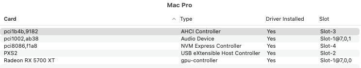Sorry, glitch when typing. The NVMe is in slot 4Can you confirm your PCIe card slot list and update your original post, as surely you can't have a USB 3.1 and an NVMe controller card in the same slot [2]? Any and all differences for machine setups on 5,1's that 'are' working with 11.3x may help others diagnose the problems many of us, like me (who can't get anything after 11.2.3 installed), are having.