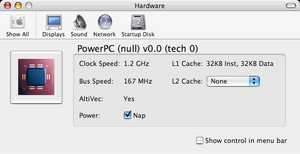 Does anyone have a Hardware section in their sys prefs that shows the G4 icon without the "G4" written on it and when you click it it lists things about the processor. The only option it saves on my machine is whether NAP is on or off....it seems to be stuck on "none" for my L2 cache and 1.2 GHz for my speed even if processor is set to highest...I don't see how the software of the OS can affect something built into the hardware but I guess it can stop sending functions to that hardware....I'm not sure if it's really affecting my system though because it's not terribly slow...I'll have to run some benchmarks to see what's up...Xbench should report the 512k....I'm not sure why this pane exists....but if you don't have it for some reason, here's what it looks like....