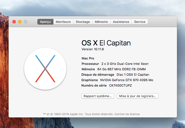just have a look at the top of the page at my Mac pro 1.1 (2006) setup with Mac OSX El Capitan 10.11.6