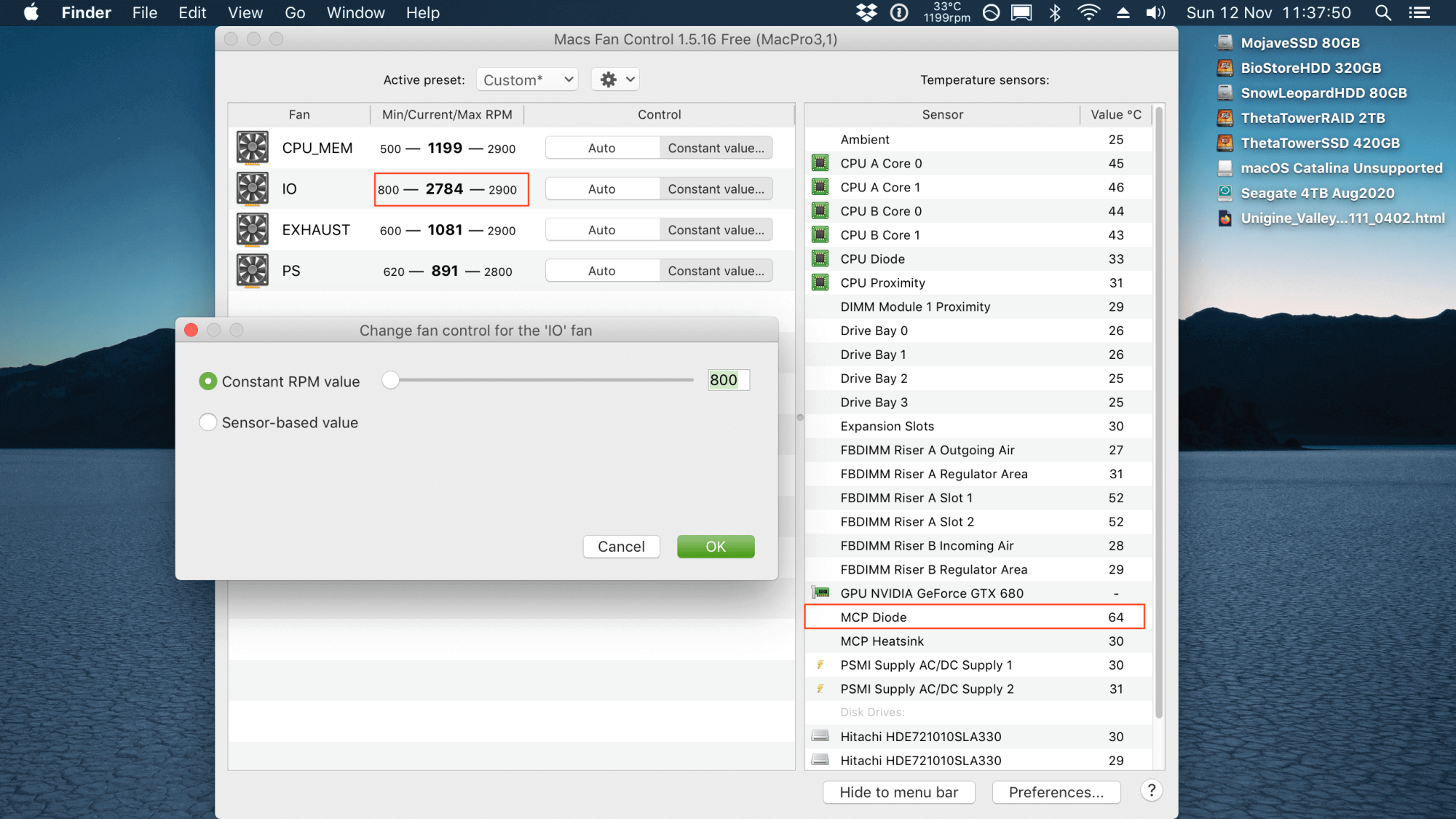 About a year ago my trusty MacPro3,1 decided to start running it’s IO fan at a constant full speed. I tried the usual SMC and PRAM resets, and renewed the thermal paste in attempt to resolve, but it made no difference.