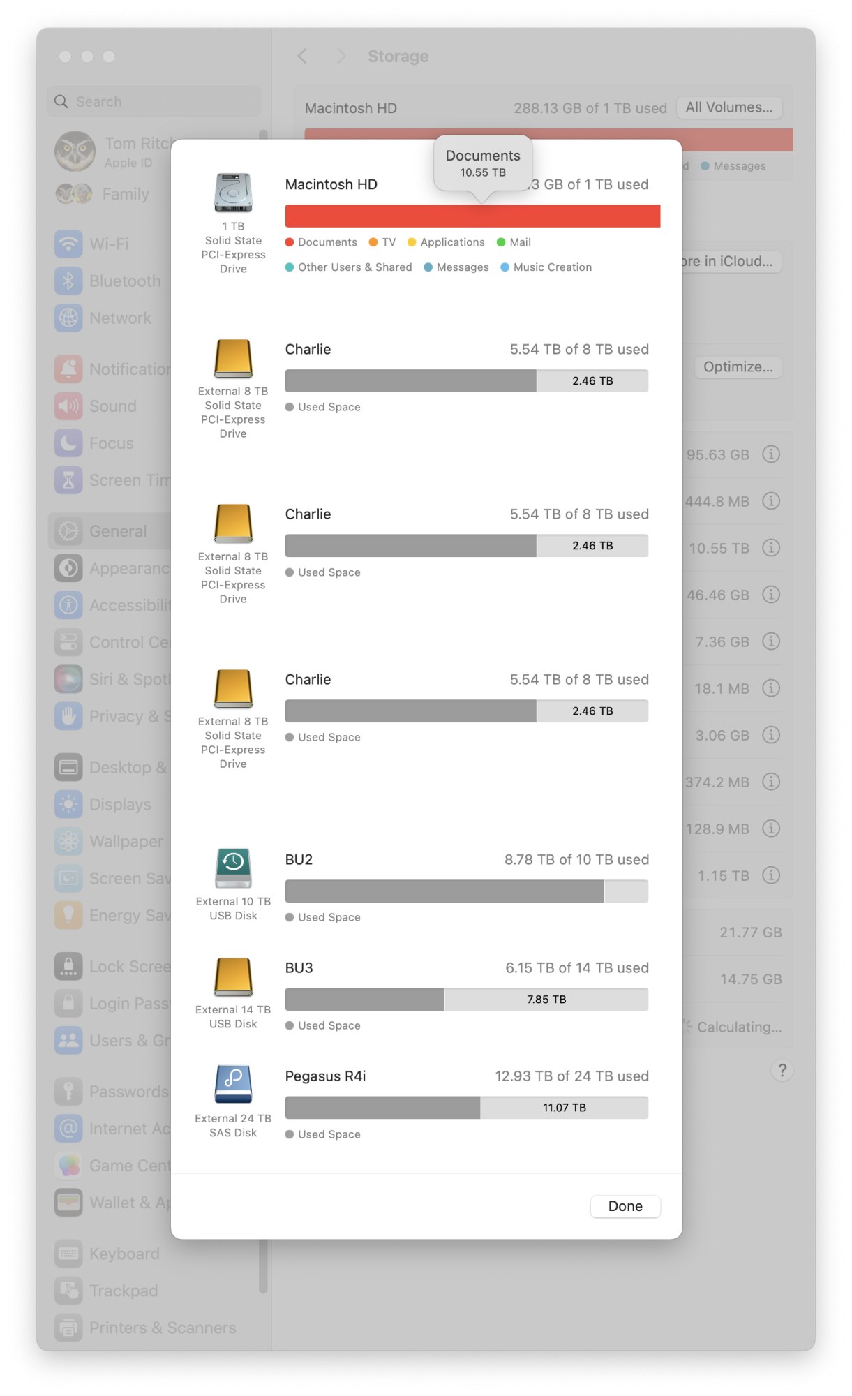 My second observation is that the system tools Apple supplies to observe how disk memory is allocated show a major problem. Have a look at System Settings / General / Storage Settings. The bar at the top shows memory allocation on the Startup Disk. A note across the top says, in my case, my system takes 288.71 GB of the 1 TB SSD. Under the bar is a key showing color assignments indicating particular uses of disk space, Strangely, the whole bar is red. Clicking the button above the bar shows space allocation on All Volumes. This displays one problem. My PCIe-mounted RAID array, "Charlie", is shown three times. Hovering my pointer above the bar shows another problem. The Settings dialog claims my Documents folder takes 10.55 TB of the 1 TB available on the Startup SSD.