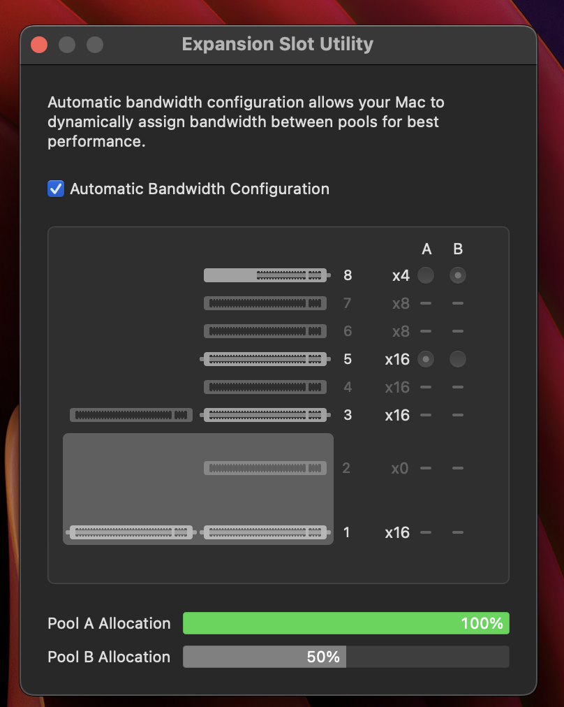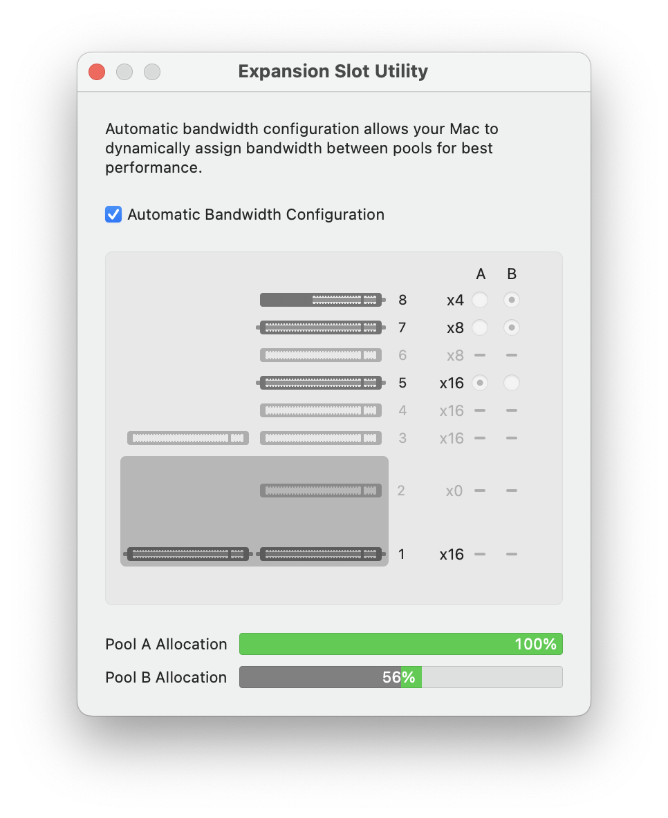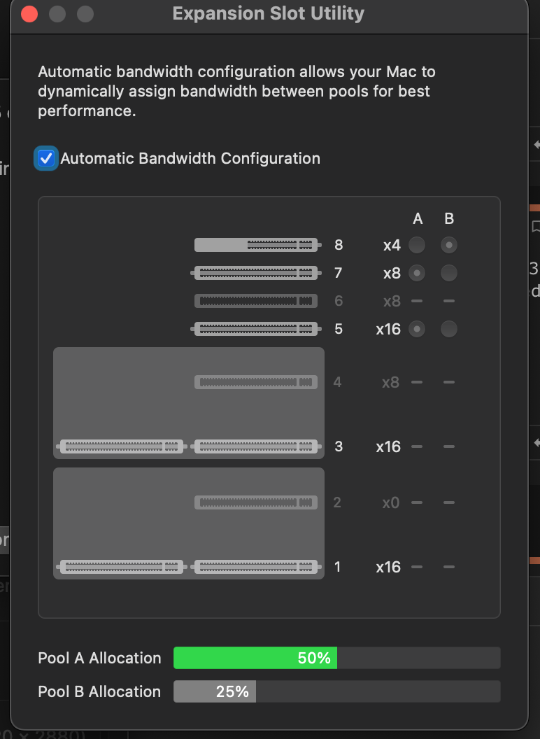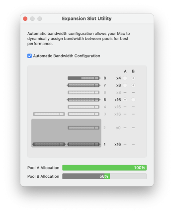So looking at some of these Expansion Slot Utility screencaps, I decided to re-check mine, and was shocked to see the previously 100% on A & B was now showing 125% on B... then I realised something for which I hadn't quite comprehended the full consequences - plugging in cables which change the port format (eg USB Type-C to Type-A, B, Lightning etc.) eats lane allocation (according to the utility).