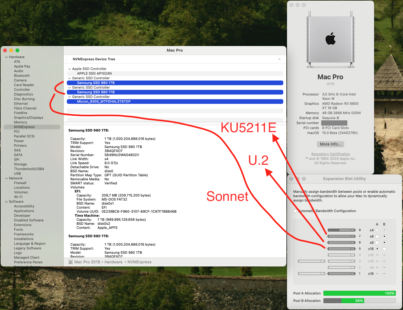 I am now running two 4 TB 990 Pros and one 1 TB 970 Pro in the Sonnet M.2 PCIe card. I get dropouts when I boot from Windows into Sonoma and I've had a dropout when I booted from Sequoia back into Sonoma.Can I ask, are you are running the Samsung 4TB 990 Pro SSDs with the Sonnet M.2 PCIe card? Any issues?