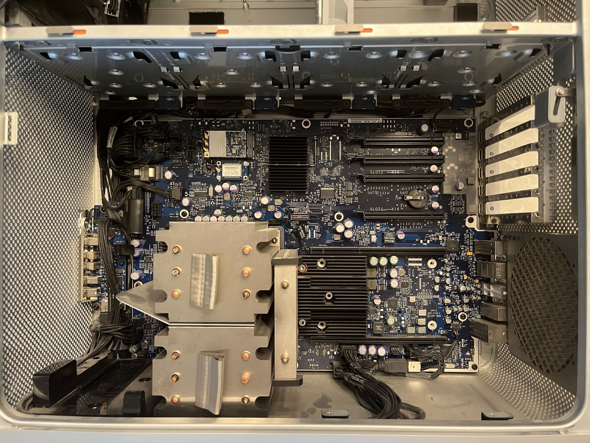 I recently got a 2008 Mac Pro from a friend as it was not working, and I’m trying to see if I can get it running again. Turing the machine on shows a solid light on the power button and causes the fans to spin at max, but it doesn't show a display or signs it had booted.