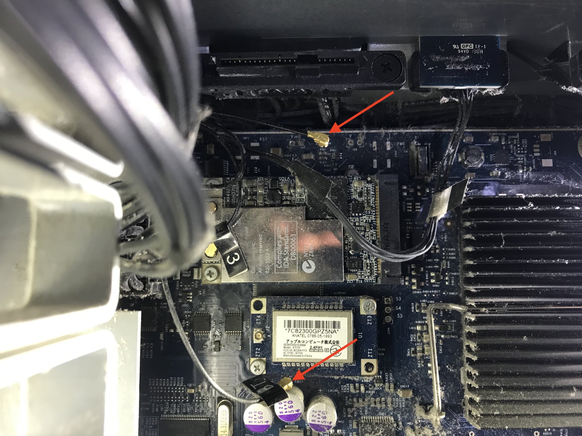 Hello all. I have a Mac pro 3.1. I installed a new graphics card this morning, and in the process I may have disconnected 2 cables. I may in fact not have disconnected anything - I just can't be sure. I have attached a photo of the two cables / connectors. They both have gold ends, and the top one has the tag "1" attached to it, and the bottom one has the tag "BT". I'm not sure what they do and where (or if) they need to reconnect. Any help would be appreciated. They are located roughly below the 2nd drive bay.