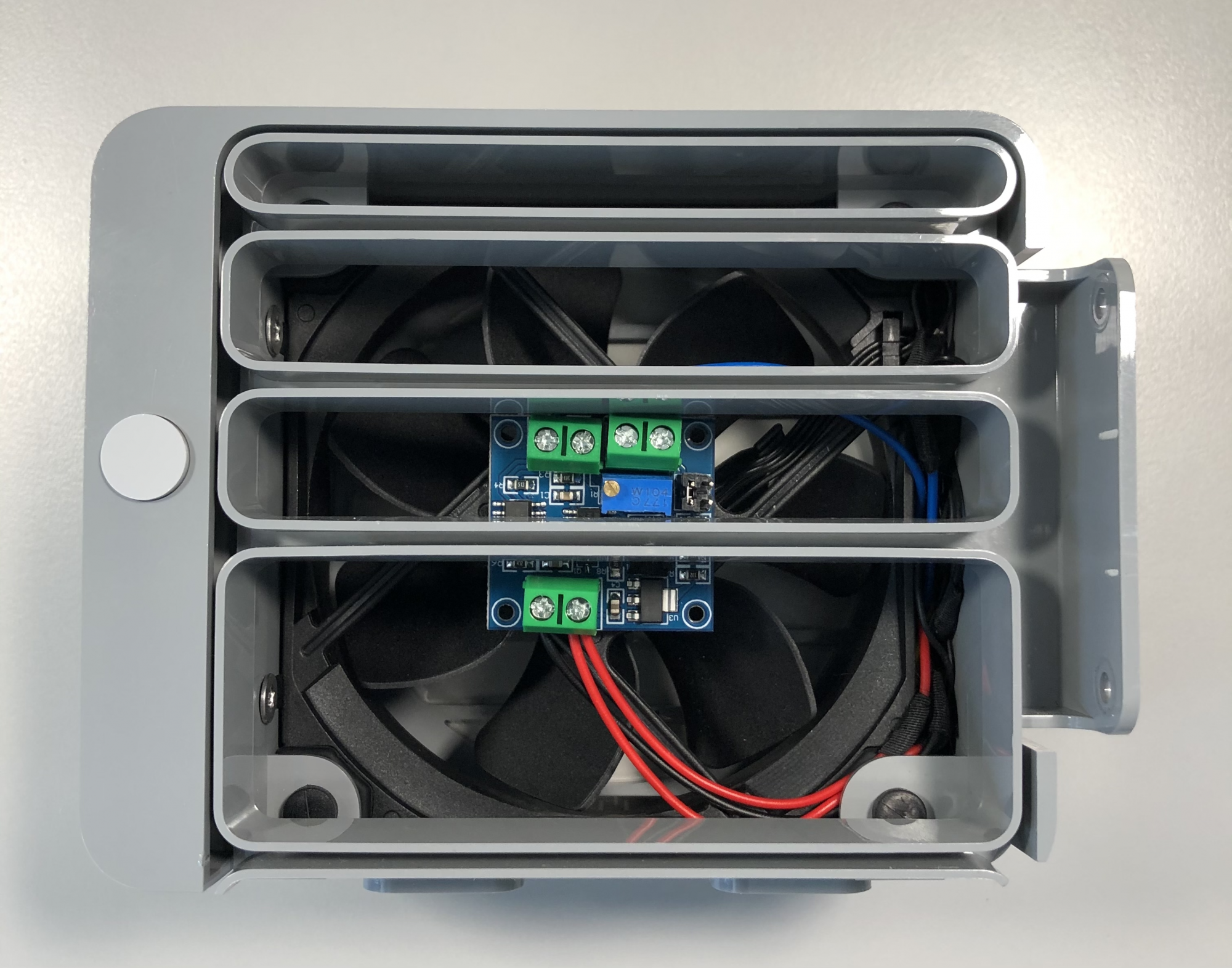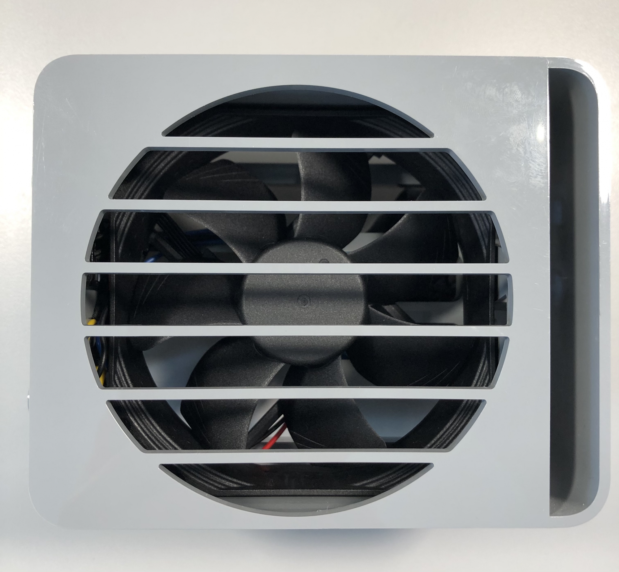 The intake & exhaust fans. Remove hardisks and CPU-tray. Loose the two fan pin contacts and the loudspeaker contact. Remove the fan cage with both fans and the internal loudspeaker. Remove the old fans and refit the new ones. Do the same pin swap as PCI. Refit the cage, CPU tray, and harddisks.