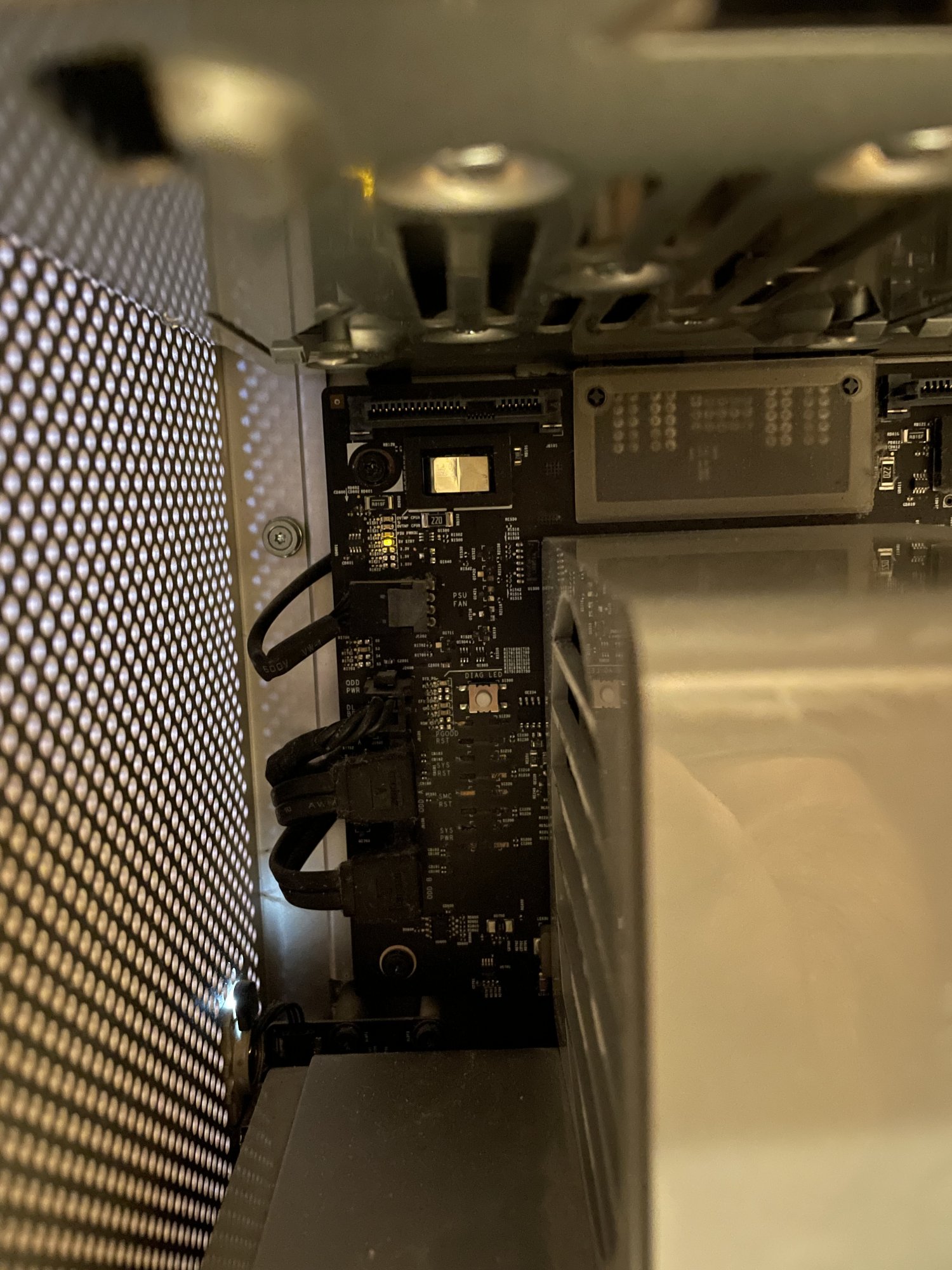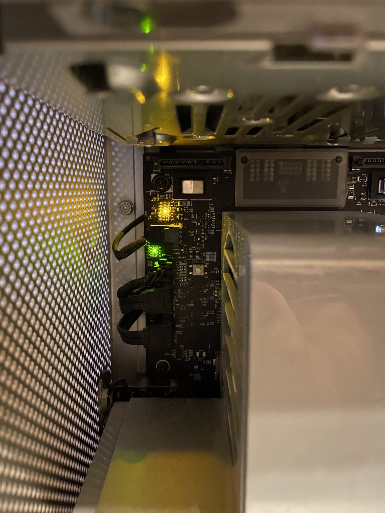 I've had a problem with the mac pro not starting... Only the fans are spinning, there is no start-up sound, when you turn it on, a red led lights up on the memory card for a moment, but then it disappears, I've attached a picture showing that there is a yellow led which is constantly lit. Is the power supply or motherboard cmos battery dead?