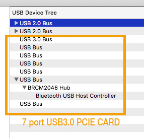 I can see the seven USB 3.0 instances in my system report. When I plug things in like HDDs and USB keys, they get power and seem to liven up. But, I can't see anything on the desktop or in Disk Utility. So the devices are there getting power but not showing up in the Mac.