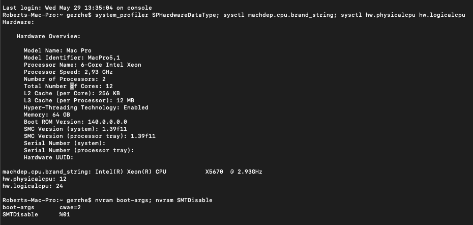 UPDATE: I forgot to say, disabling SMT appears to be honoured under Boot Camp Windows 10 as well. Certainly mdstool and Task Manager report results in line with there being 12 cores and 12 threads.