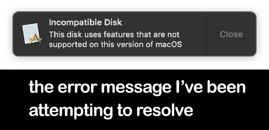 - only issue was “Incompatible Disk” error (screenshot). Began troubleshooting this.