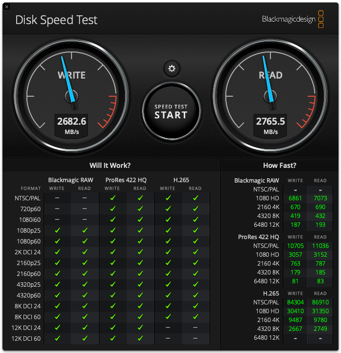 My plan is to do my video editing on the 2TB Samsung Evo Plus and to then move completed projects to the 14TB WDC Red HDD. I haven’t yet tried a video edit but a Blackmagic speed test suggests I’m getting roughly 2700 MB/s for both reads and writes… which makes me smile.