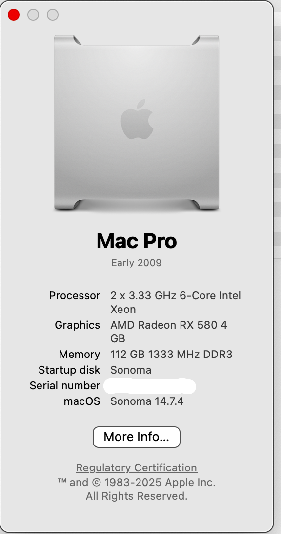 Mac Pro 5,1 running Catalina. 32Gb Ram, RX580 Graphics and a Titan Ridge 2.0.