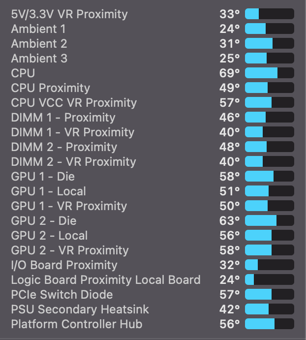 For comparison, the sub 70°C I mentioned for my machine are with a 5K display connected via Dual Displayport. (Basically two 2560x2880 displays).