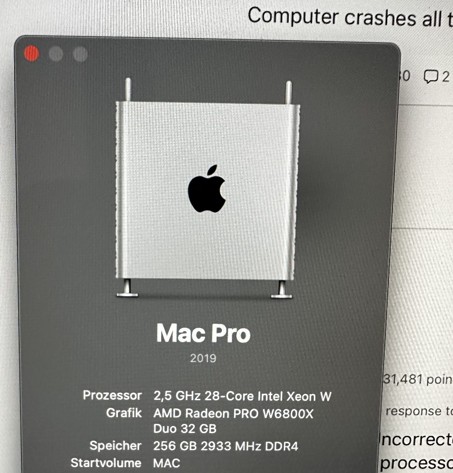 I have a MacPro 7.1 and got a CPU error report at the beginning ( that's how it started ). After that the Mac restarted every now and then. If I tested Cinebench or transferred a lot of data from a SSD via Thunderbolt it also froze or went off. At some point it didn't boot up to the operating system and I was able to wipe the hard drive using Disk Utility because I thought it might be something with some software. Unfortunately this was not the case. After hours of rebooting I managed to reboot the operating system again (also many times it went off again and again). After the operating system (Ventura) was back on it I thought OK maybe it was now and the error is gone. But he booted sometimes yes and sometimes no with error and always restarts. Then it started normally and I could move around in Ventura, but when I went to the screen saver settings it froze again or restarted. OK then I went to the Apple Store and was able to demonstrate the error and left the device there, unfortunately the warranty has expired and an Apple Care I have not continued. Apple thinks it would be probably 99% of the processor (and this is far from cheap at Apple). I do not know if anyone has ever had this kind of error and can perhaps give me some advice and whether it is also the CPU at all ? After I picked up the MAC, the hard drive has been completely erased by the Apple Store and unfortunately I can't reload it because it always restarts with the error message. For tips and assessments I would be very grateful.