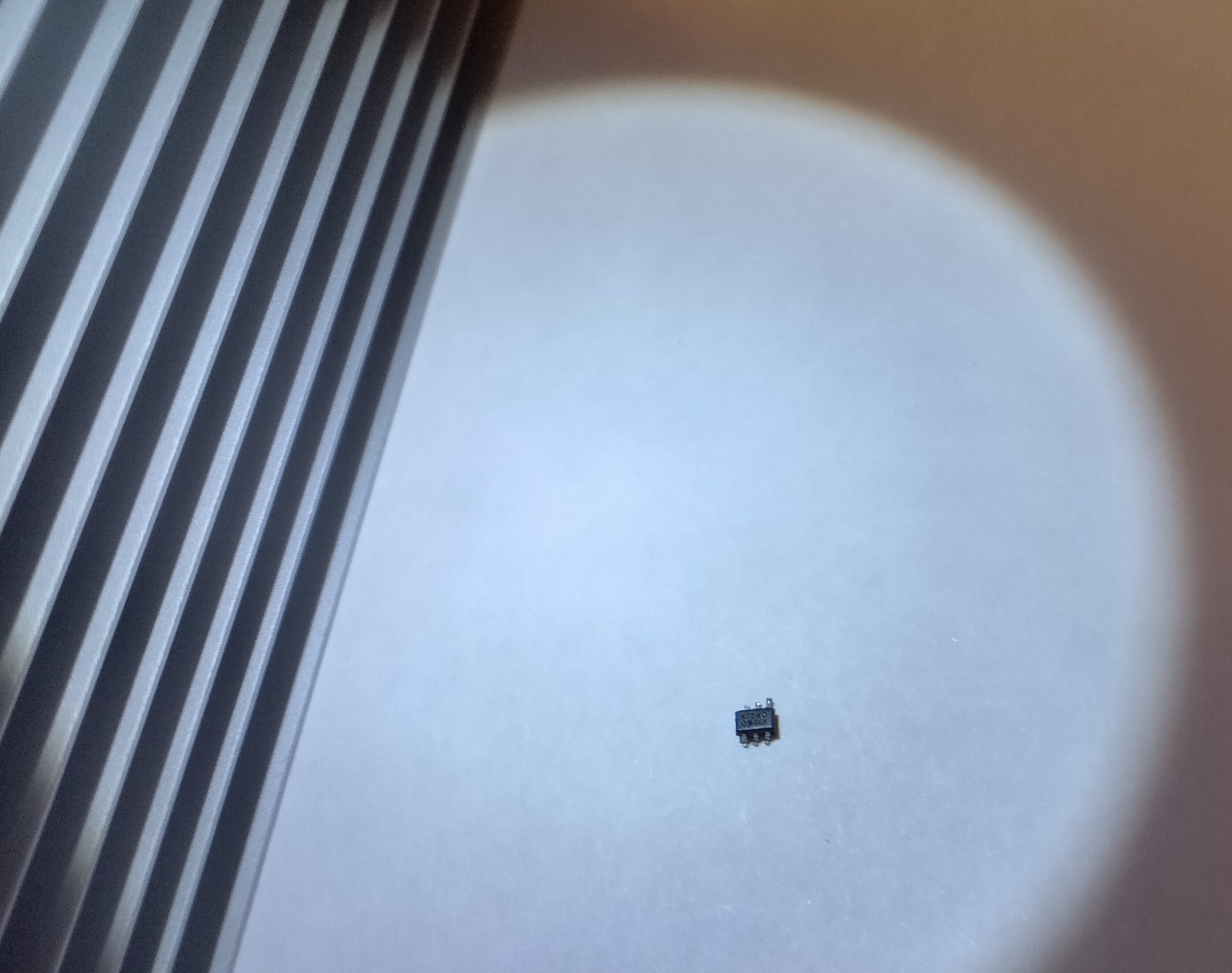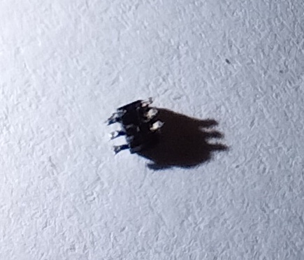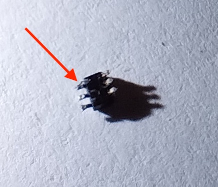 But still no luck with the freezes. Carried out deep RAM tests, swapped RAM, zapped PRAM, no luck. So I disassembled again, and then suddenly noticed this tiny little item on my worksurface. Under microscopic examination I could see the letters "K72WO" on the top, and six tiny pins. Crap ! I've broken off a microscopic chip from somewhere unknown on the CPU tray.