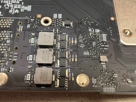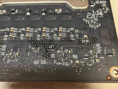 On Wednesday morning, I got back to the Mac Pro and inspected the CPU board again. I had noted (above) that there were one or two places that could use further cleanup. I went over the board, again, carefully scrubbing any areas that looked like they might harbor foreign matter. Then I cleaned the board and used canned, compressed air to clear away any debris and dry the surfaces. I paid particular attention to the SMCs, blowing at their bases to dislodge anything that might be harbored in or under the SMC or its pins and blow away any remaining moisture.