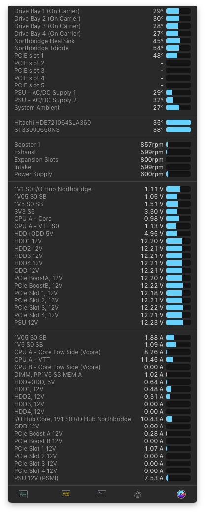 This morning I decided to replace the PRAM battery after reading that as a suggestion on a thread in here. Already depressed by the disappointment of a dead cMP, I pressed the power button not expecting anything, and woe and behold it POSTs and it's running again. I've since done three more shutdowns/restarts and no issues at all that I can tell. See iStat Menus Sensors snapshot below.