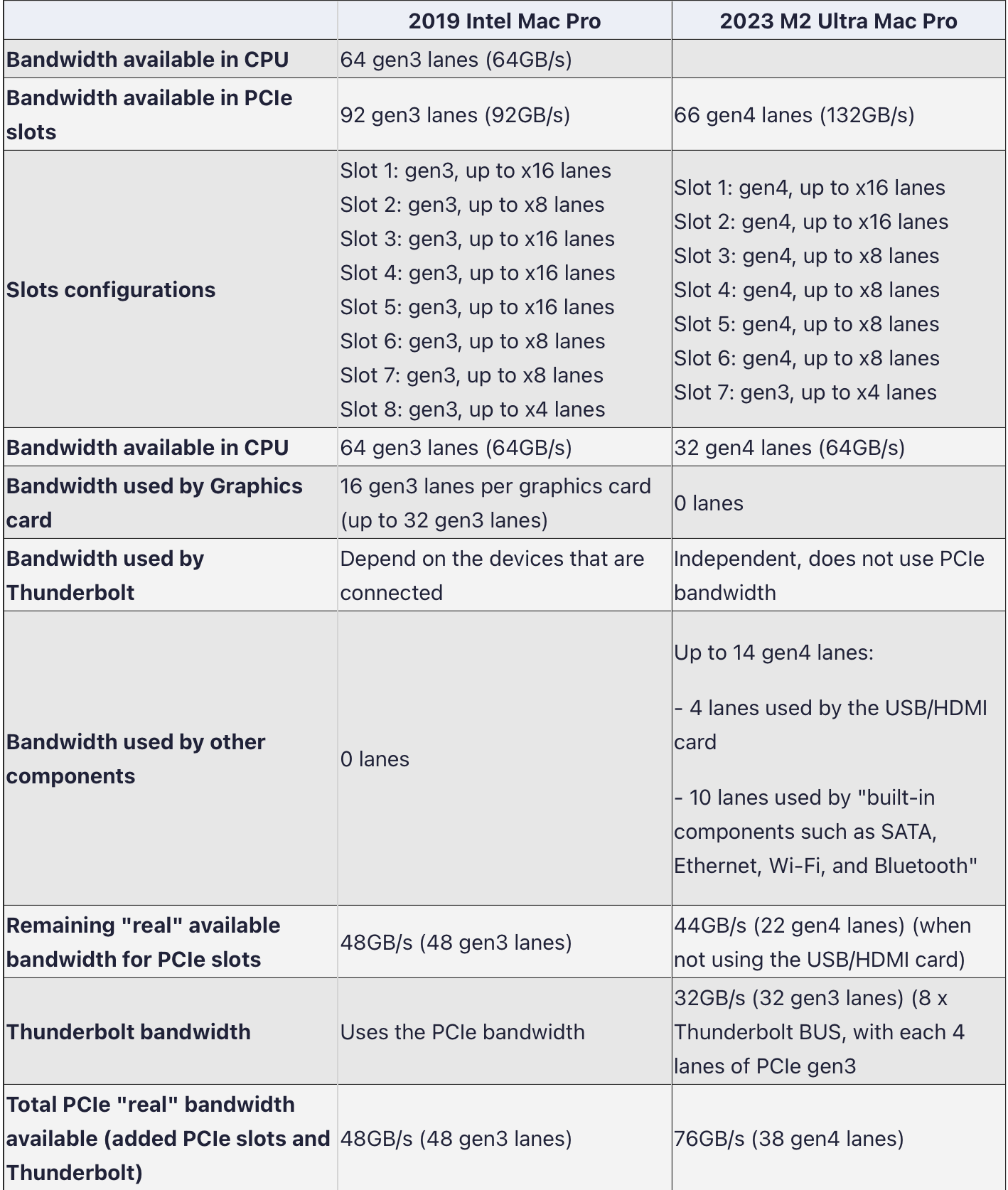 This is a very interesting chart. Guess not as gimped as I thought. Although I agree that the PCIe slots in the 2023 Mac Pro are mostly useless since no GPU support. Shame they did not at least include the extra power part of the MPX slots, so anything other than GPU cards using it could work still.The MPX slots supported extra power and Thunderbolt. Which isn't supported anymore with the new M-series in Mac Pro. But I have not tried to analyse the board layout, because I have not been curious enough.