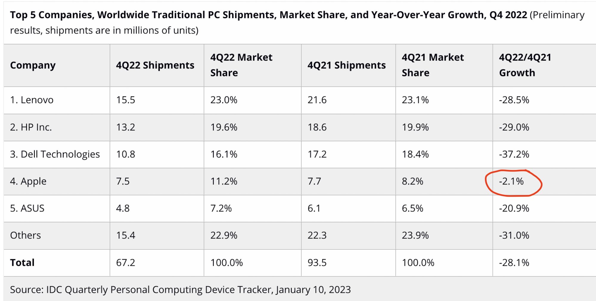 HP and the other manufacturers are down by a lot too. I think the market is beginning to return to its pre-pandemic levels. People who would've bought cheap laptops or desktops are opting to stay with their mobile devices, namely their smartphones. Most consumers are frugal on technology, so those users could've opted to stay with their older machines and use their smart device as a daily driver. This isn't new, the crash happened to Apple later than the rest of them.