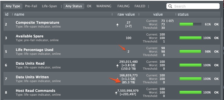 My ‘PC’ and Mac mini are only a couple months different in age. I have very little personal information on my Windows machine whereas the Mac is mostly for “typical” usage (e.g., email, web browsing, photos, music). The PC SSD has had ~10.9 TBW thus far — it also has a 2TB drive, so that’s practically nothing for wear.