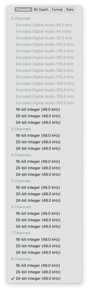 Thank you so much! This is exactly what I wanted to see, but I don't like it! No other rate, only 48kHz.Mac Studio hooked up to my Denon X3300W, via OWC Thunderbay 8 with a displayport to HDMI adapter (if that makes a difference). Let me know if there's anything else you want me to test, happy to do it when I get a minute.