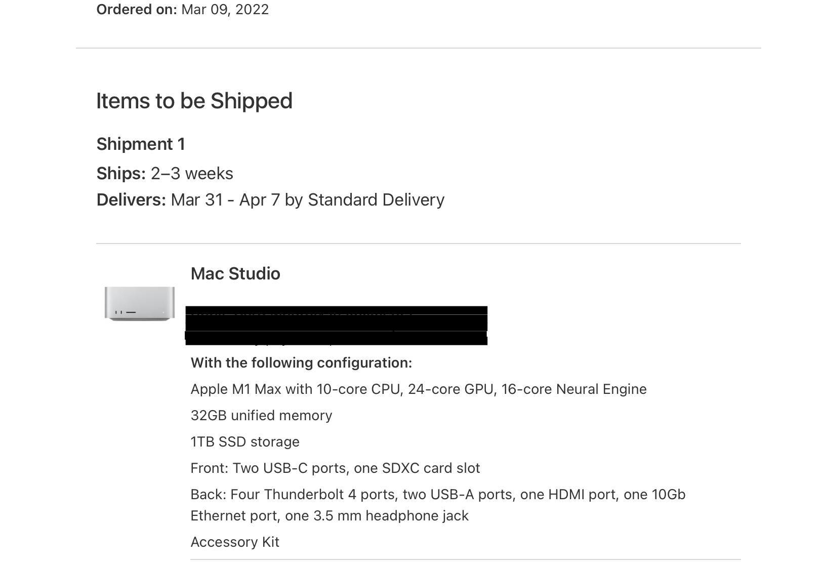I ordered the M1 Ultra 20-core CPU, 48-core GPU and cancelled it immediately again. 😅 Then I went for the M1 Max 10-core CPU, 32-core GPU. I also ordered the Studio Display with Vesa mount, the black Magic Mouse and the white Magic Keyboard without the number pad.