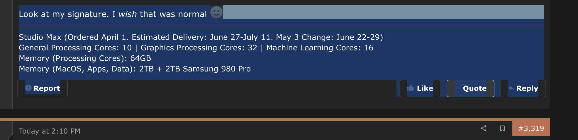 My April 9 order for a Max Studio was just moved up from a mid-July delivery to a UPS delivery date of Tuesday next week! That's great, but it's a full 2 weeks before the Studio Display delivery range. I plan to see if Apple will allow me to extend the return period to when the display arrives. I don't have any other displays and don't want to lose the return window before I can turn it on and test it out. Might work out for the best if they announce something else I may want at WWDC.